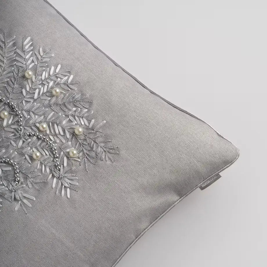 Die hellgraue Farbe mit der markanten silbernen Stickerei und den Zierperlen setzt in jedem Interieur einen einzigartigen, festlichen Akzent. Das asymmetrisch gestickte Blumenmotiv ist ein echter Blickfang und fügt sich harmonisch in klassische wie moderne Einrichtungen ein. Der Kissenbezug „Arvores“ mit den Maßen 45 x 45 cm rundet den Charakter Ihres Wohn- oder Schlafzimmers perfekt ab und ist ein elegantes Geschenk für besondere Anlässe.