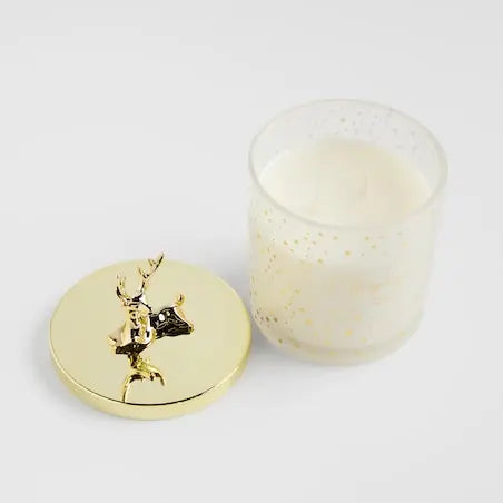 Deckel: Der luxuriöse, goldfarbene Deckel aus beschichtetem Metall ist mit einem majestätischen Motiv eines springenden Rentiers verziert. Der Deckel dient als stilvoller Ständer oder zum Schutz des Wachses.