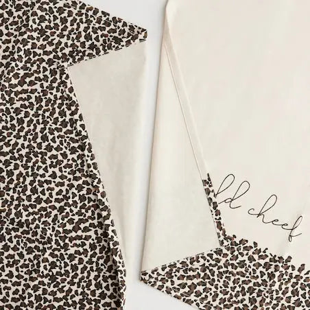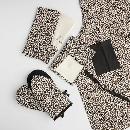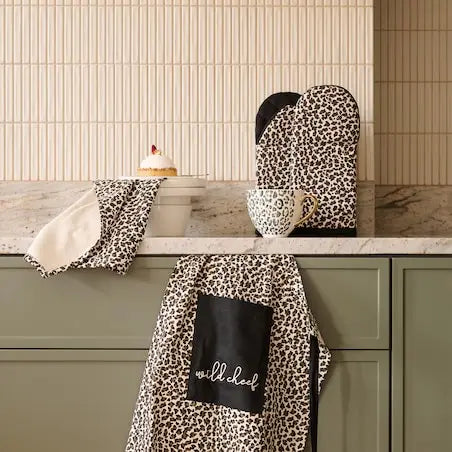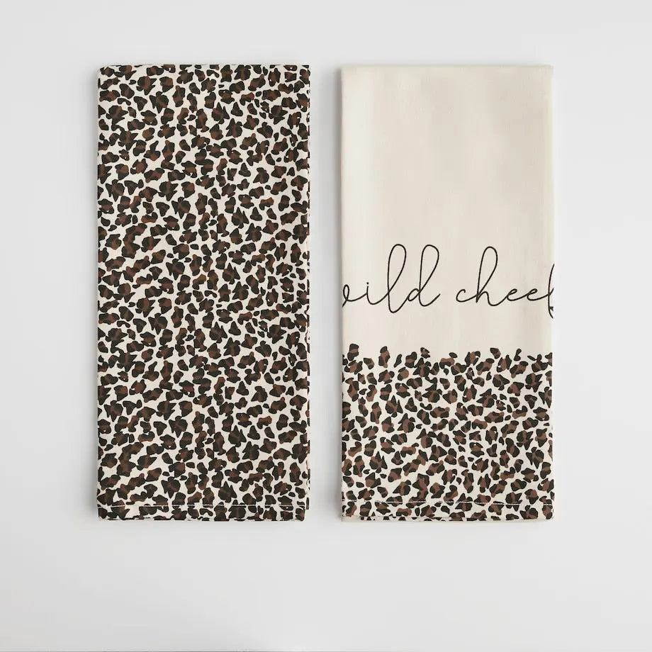 Set aus zwei beigen Küchentüchern aus Baumwolle mit trendigem Leopardenmuster. Jedes Tuch misst 45 x 65 cm und ist daher praktisch und bequem für den täglichen Gebrauch. Sie sind weich, saugfähig und langlebig, ideal zum Abwischen von Geschirr, Arbeitsflächen und Händen und verleihen Ihrer Küche gleichzeitig einen stilvollen Touch mit Tiermotiven.