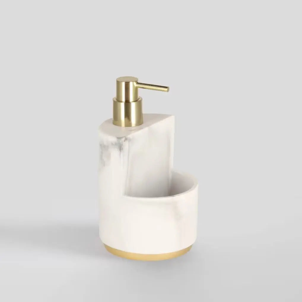 White dispenser with a place for a sponge. It is made of high-quality polyresin. It has a gold plastic pump. Its great advantage is the possibility of using it for various liquids of your choice: liquid soap, liquid disinfectants, dishwashing detergents. A stylish accessory ideal for the kitchen. It will allow you to save cleaning fluid and at the same time limit the spread of bacteria. Easy filling by unscrewing the top of the dispenser.