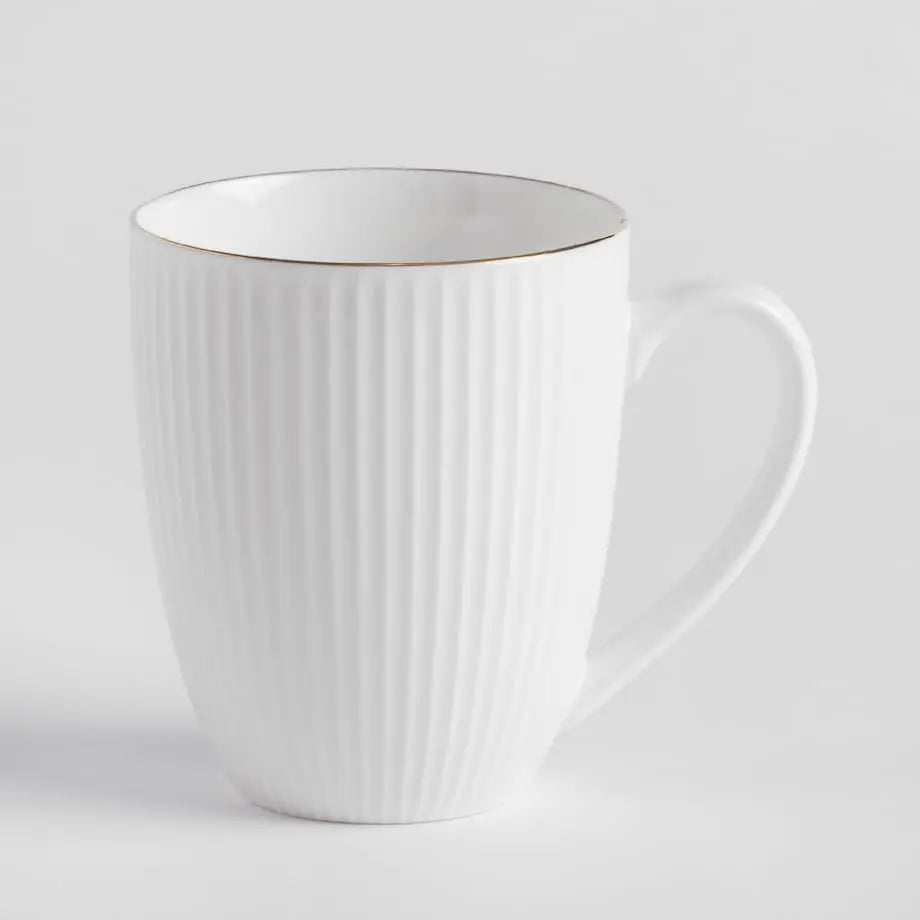 Classic white porcelain color Here it has been enhanced with a vertical, fluted pattern that subtly reflects light and highlights the texture of the vessel. The thin gold trim on the rim is like a delicate jewel accent, adding unique character without being overly ostentatious. Sturdy, shaped handle provides a secure grip and the harmonious shape and proportions make from a mug A beautiful addition to any interior - both classic and modern.