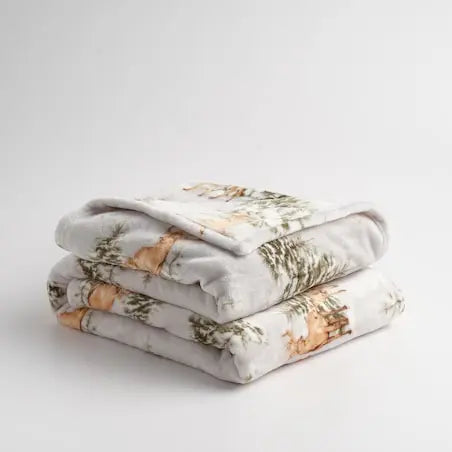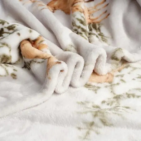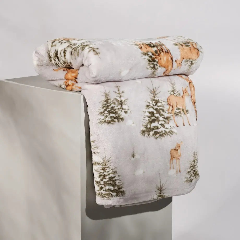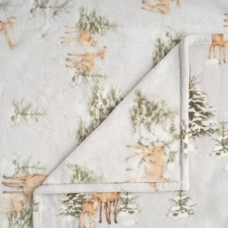 The blanket features a charming, festive pattern with deer and snowy Christmas trees on a light beige background. The beige background color gives the blanket an elegant touch and makes it the perfect addition to any interior, adding a cozy touch. The Christmas trees and deer bring a magical, festive atmosphere to your home. This blanket also makes a great gift for a loved one.