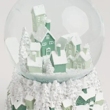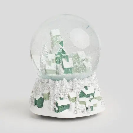 This snow globe is a charming and elegant Christmas decoration that captures the charm of a snowy winter village. Its light green color scheme gives a modern and fresh touch to the classic design.
