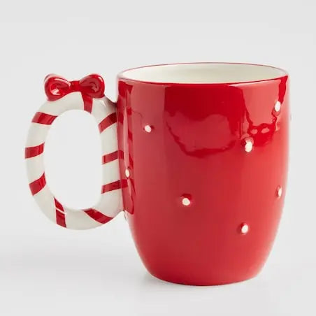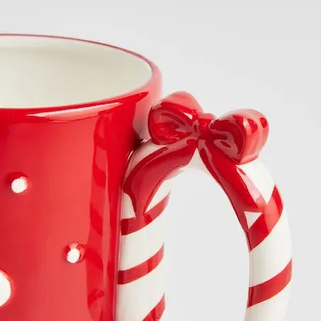 Handle: The handle of the mug has a playful candy cane shape with a red and white striped pattern, finished with a cute red bow at the top.