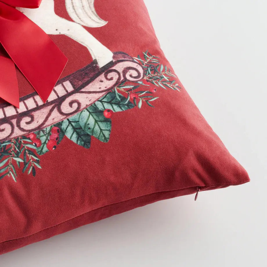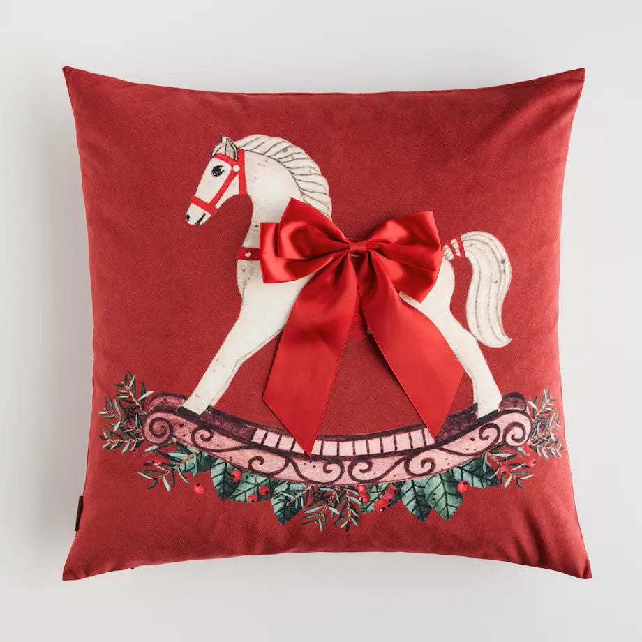 Red pillowcase with a white rocking horse print, decorated red bow and coniferous branches with red berries, is the quintessence of the Christmas atmosphere. It fits perfectly into classical and modern interiors , it will add charm and festive shine. The Trottino pillowcase is also a great gift idea for a loved one.