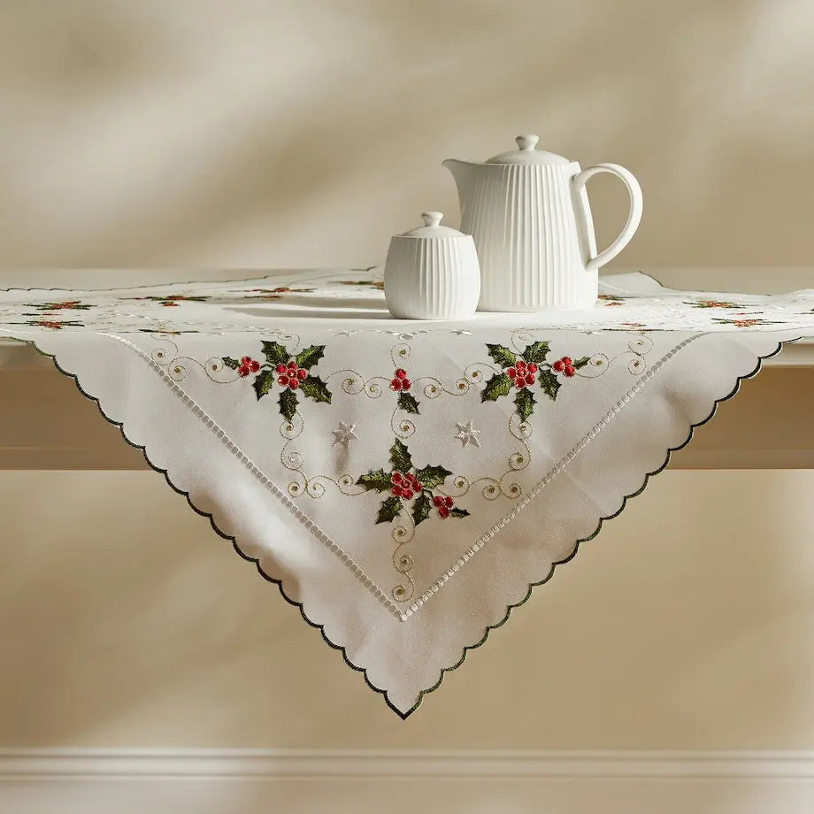 Christmas square blanket/tablecloth with detailed holly embroidery