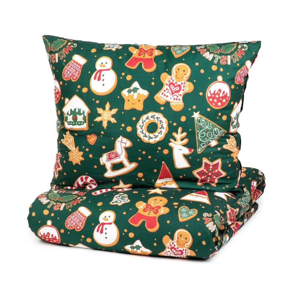 Christmas bedding set GRINCHY consists of a duvet cover measuring 140 x 200 cm and two pillowcases measuring 70 x 80 cm . The beautiful pattern features festive elements such as Santa Claus, snowmen and candy canes, creating a repeating motif that adds a unique festive charm to the interior.