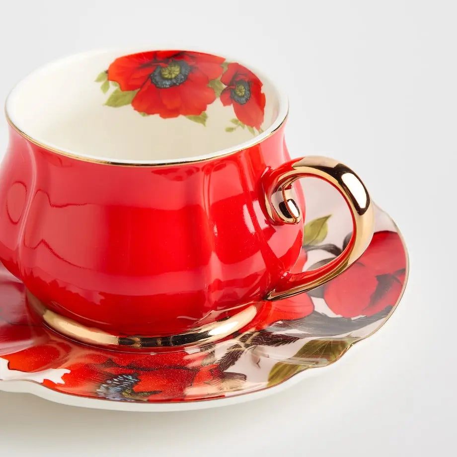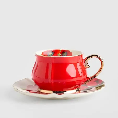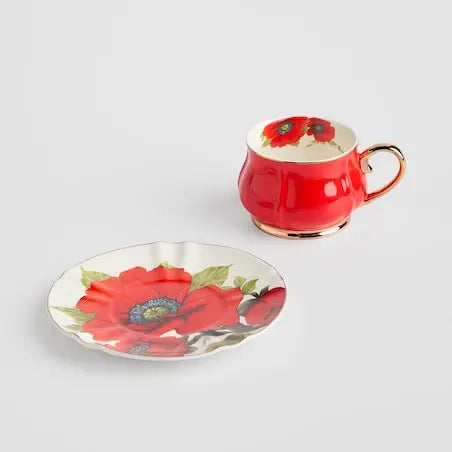 The Lascivia set impresses with its deep red color, which adds a touch of sensual elegance. The classically shaped cup complements the saucer with a gently wavy edge, decorated with a subtle floral motif. The gold trim adds a touch of sophistication. The set fits perfectly into both classic and modern interiors. It is also a great gift idea for a loved one.