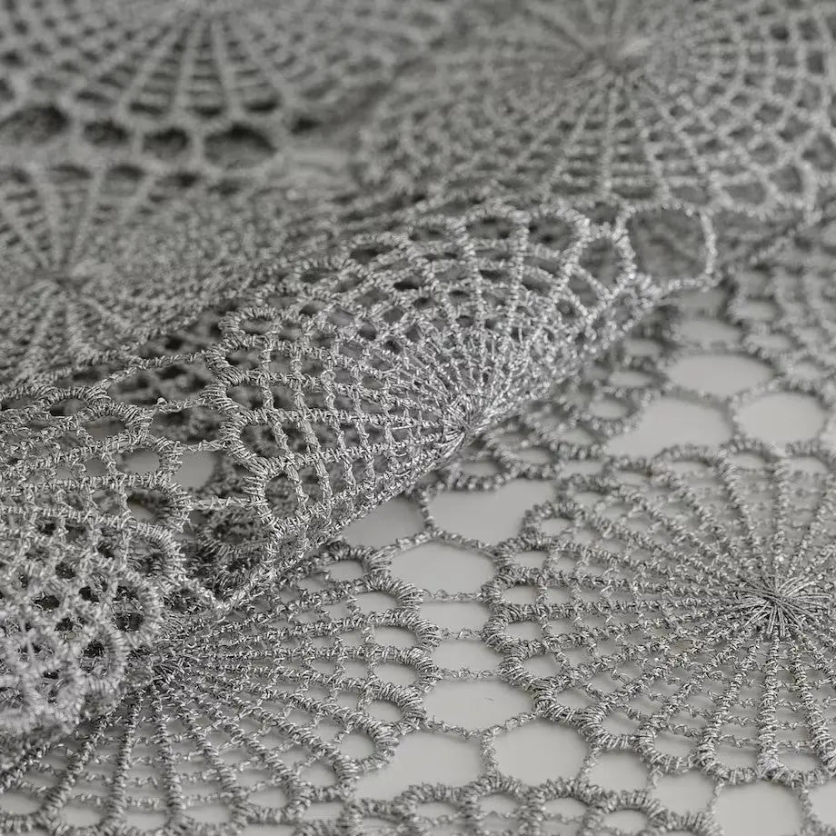 Beaulieu is a silver decorative runner with an unusual shape, displaying round patterns with a mesh structure. The silver color adds elegance to the product and the crocheted style adds an idyllic, homely style.