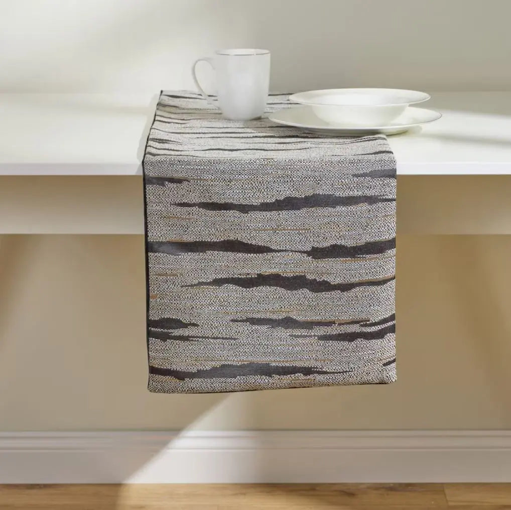 Gold polyester stole. It is an elegant and impressive accessory that will add shine to any device. It is ideal for longer tables and creates a unique environment for served dishes. The subtle shine of the metallized fiber in combination with the dark gold shade gives the interior a luxurious accent, ideal for festive occasions and everyday dining. It is easy to maintain, which makes it a practical choice for every dining room.