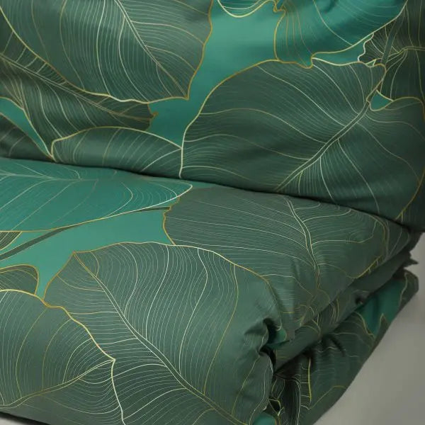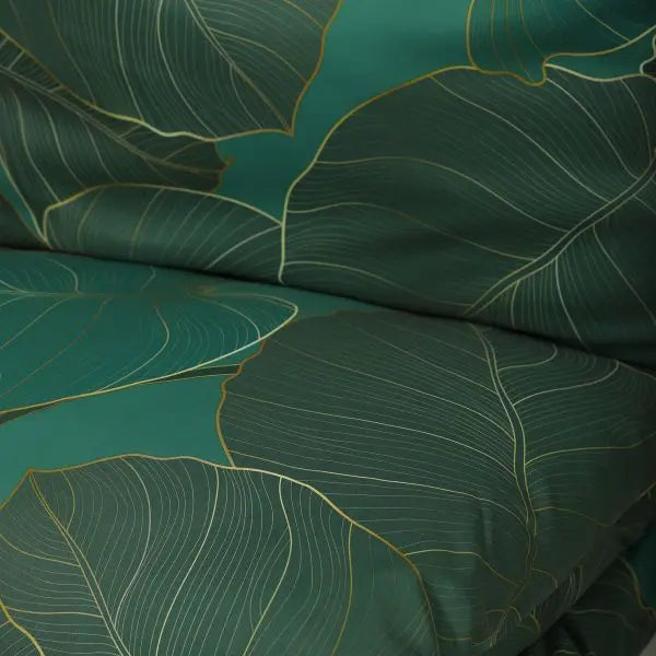 Mikrovláknové obliečky GALLO so zelenými listami je produkt pre všetkých milovníkov botanického štýlu! Krásny odtieň tmavozelenej a zlaté akcenty sa krásne spoja s interiérmi, kde sa pridávajú prírodné materiály, ako aj s glamour spálňami.