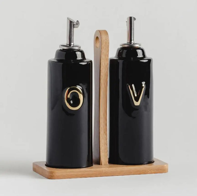 Black oil and vinegar set on a wooden base.