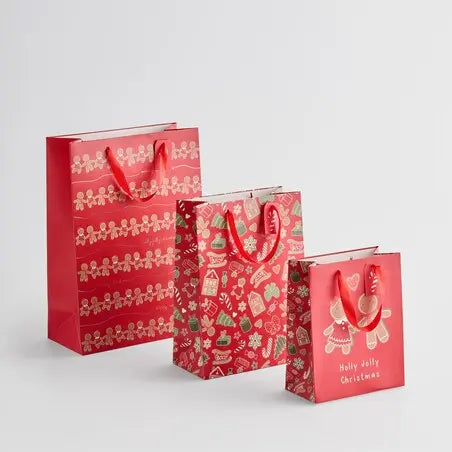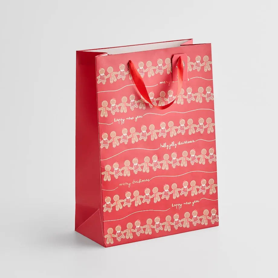 This Christmas gift bag is the epitome of traditional holiday packaging with its deep red color and elegant gold print . It is made of sturdy paper with a playful gingerbread motif that instantly creates a Christmas atmosphere. With its generous dimensions (height 42 cm, length 30 cm), it is ideal for wrapping medium to larger gifts. This bag ensures that the packaging is as impressive as the gift inside.