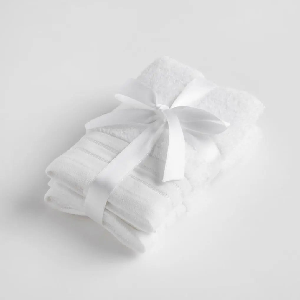 White towel set. The product is made of cotton. It has excellent absorbency and antibacterial properties. Its fine structure is safe for sensitive skin and its antibacterial properties help protect the skin from the development of bacteria.