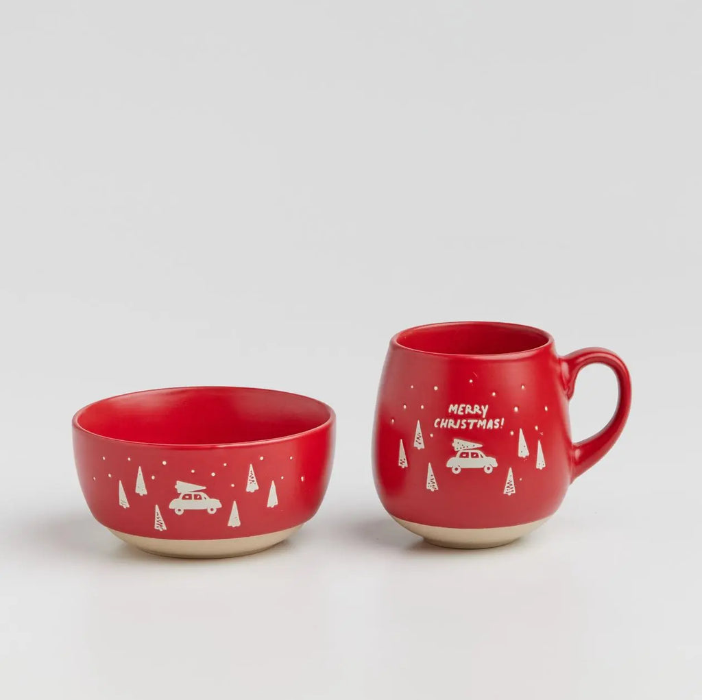 Red Christmas ceramic mug and bowl with the words MERRY CHRISMAS! and a white picture of a car with a Christmas tree.