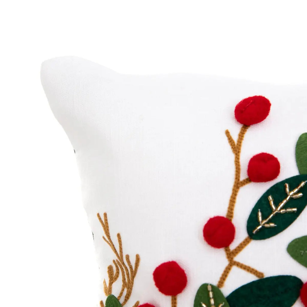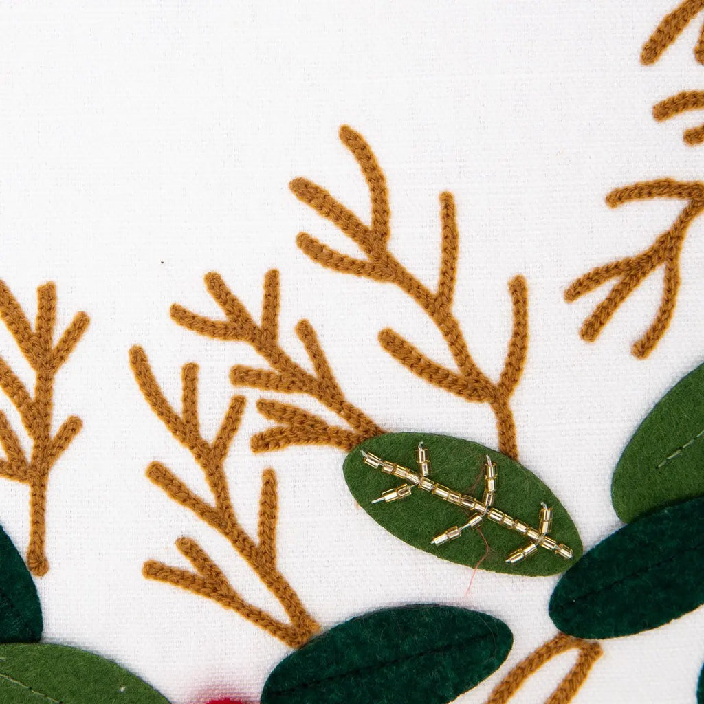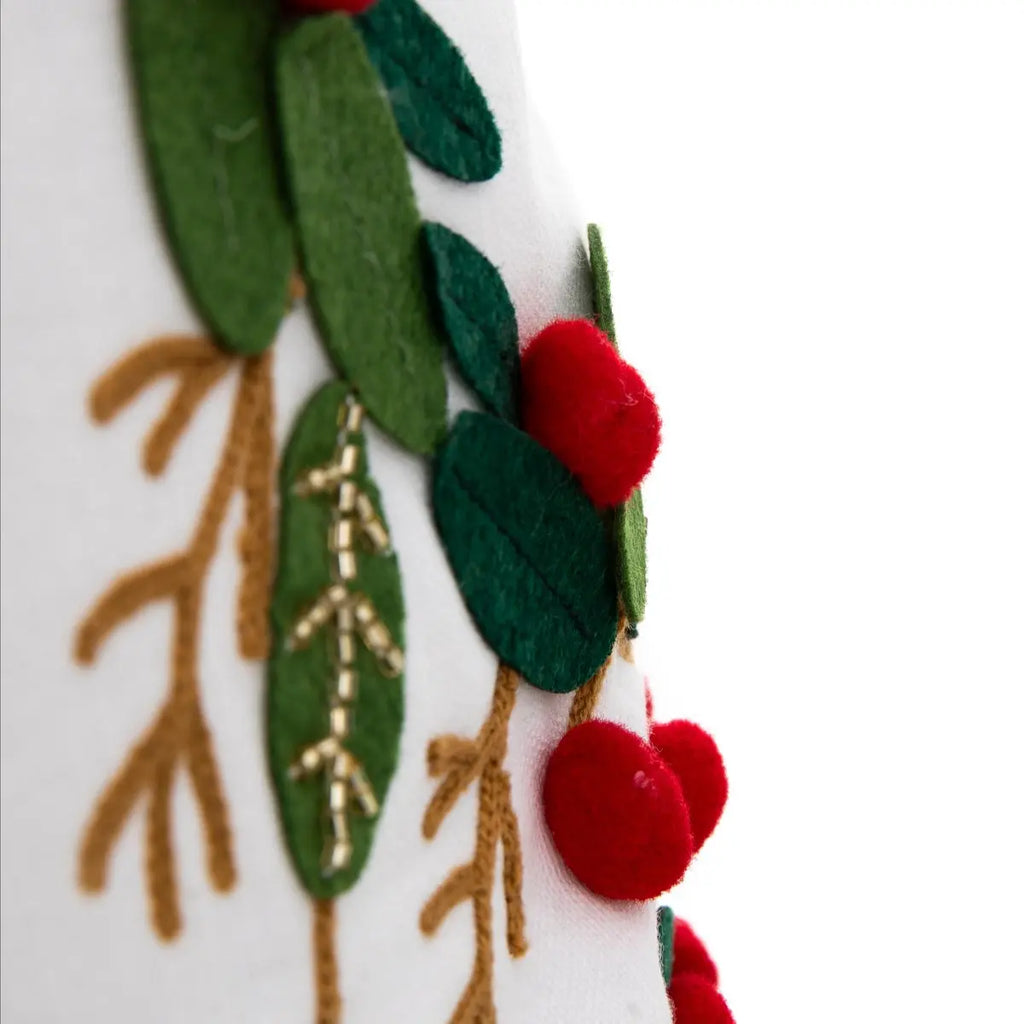 The FOSTI pillowcase will transform ordinary small pillows into an integral element of Christmas decor. We decorated the front of the pillowcase with an embroidered pattern in the shape of a Christmas wreath with the addition of gold beads and small pompoms that imitate red hawthorn berries. High aesthetics and careful workmanship make the pillow look great both on its own and against the background of other decorative covers.