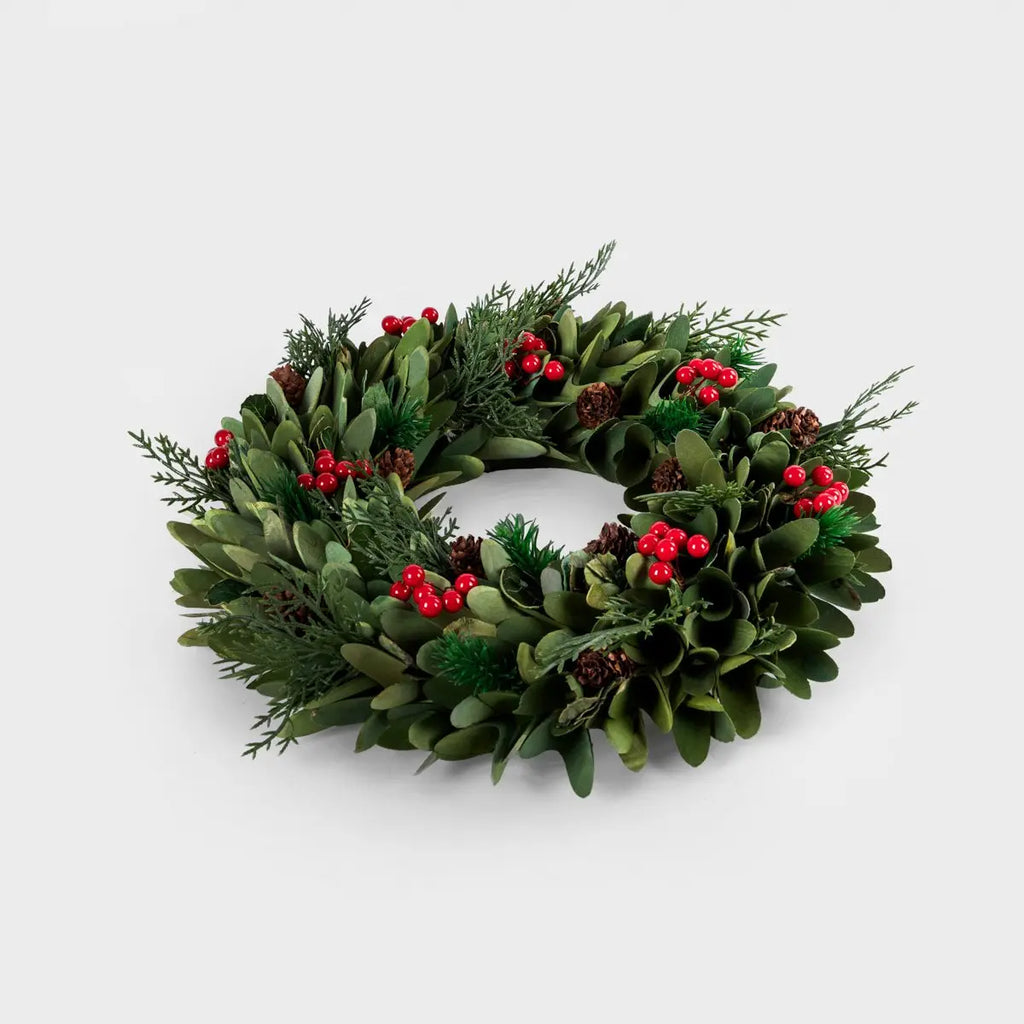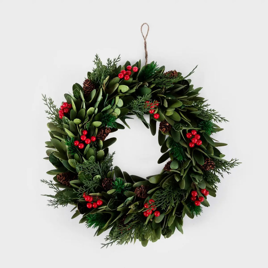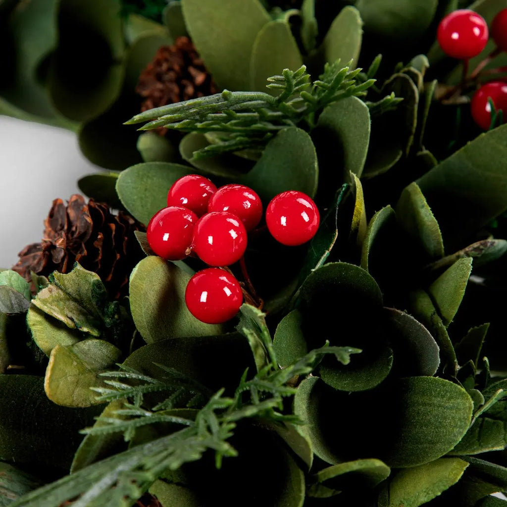 The TOPIS Christmas wreath with a diameter of 33 cm will bring a cozy, festive atmosphere to your home. Its thick, green branches have been diversified with delicate, red berries and pine cones, creating a natural, harmonious composition. It is a perfect addition to a door, wall or fireplace, emphasizing the magical mood of Christmas.