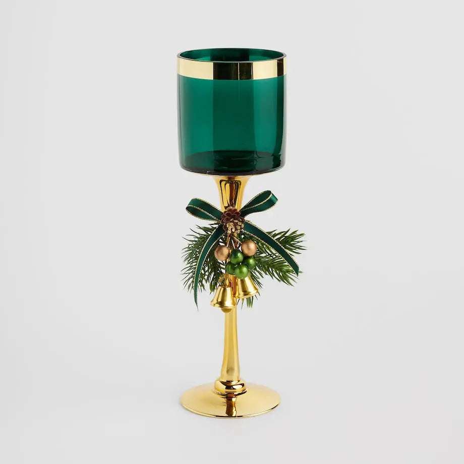 This is a tall, elegant candlestick with a Christmas decoration, designed to hold a tealight.