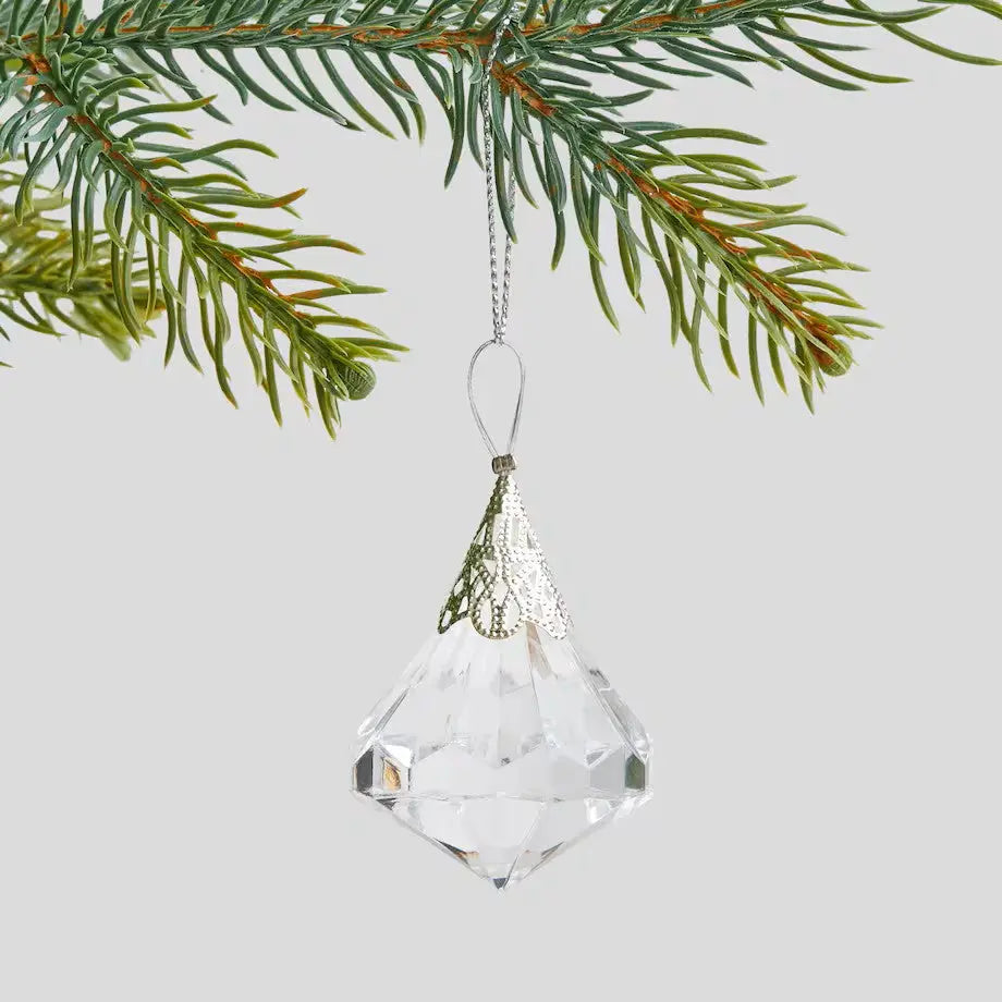 Transparent diamond shape with many facets and silver open hood It attracts attention with its subtle radiance. Geometric shape fits perfectly into glamour style and modern interiors . Christi decoration It will work as a Christmas tree ornament as well as an unusual accent on the Christmas table or in decorations. It is also a great idea for a small, an elegant gift .
