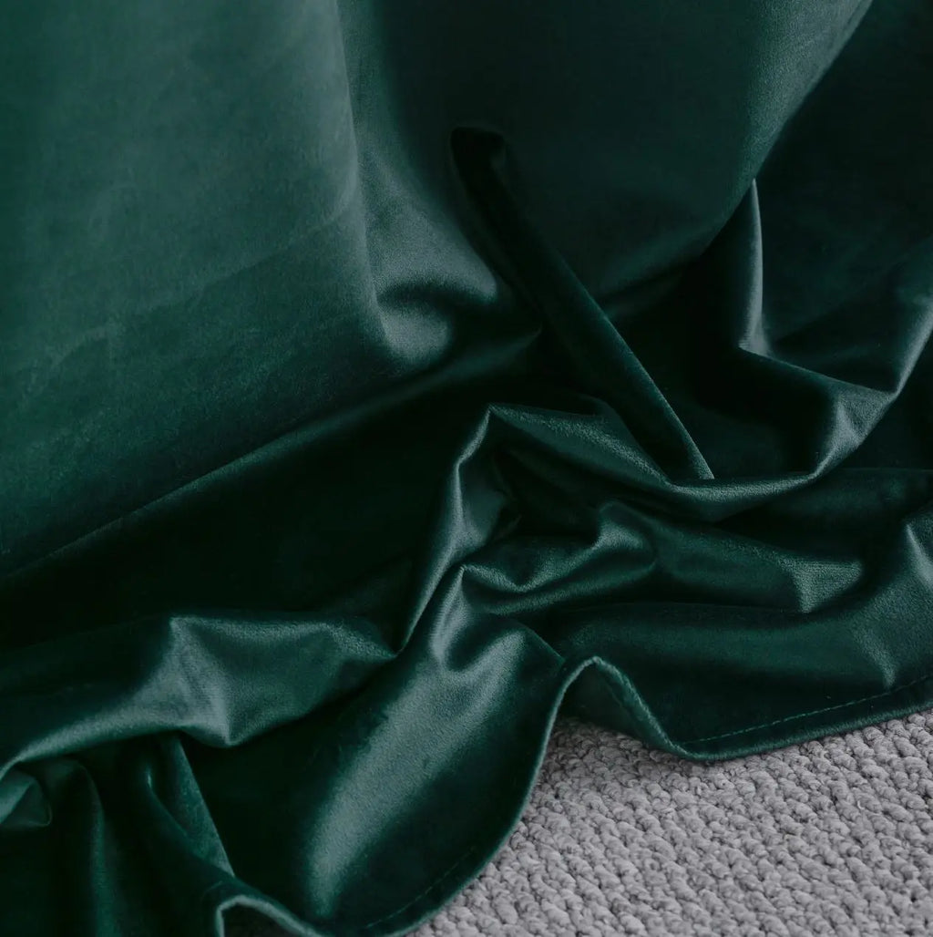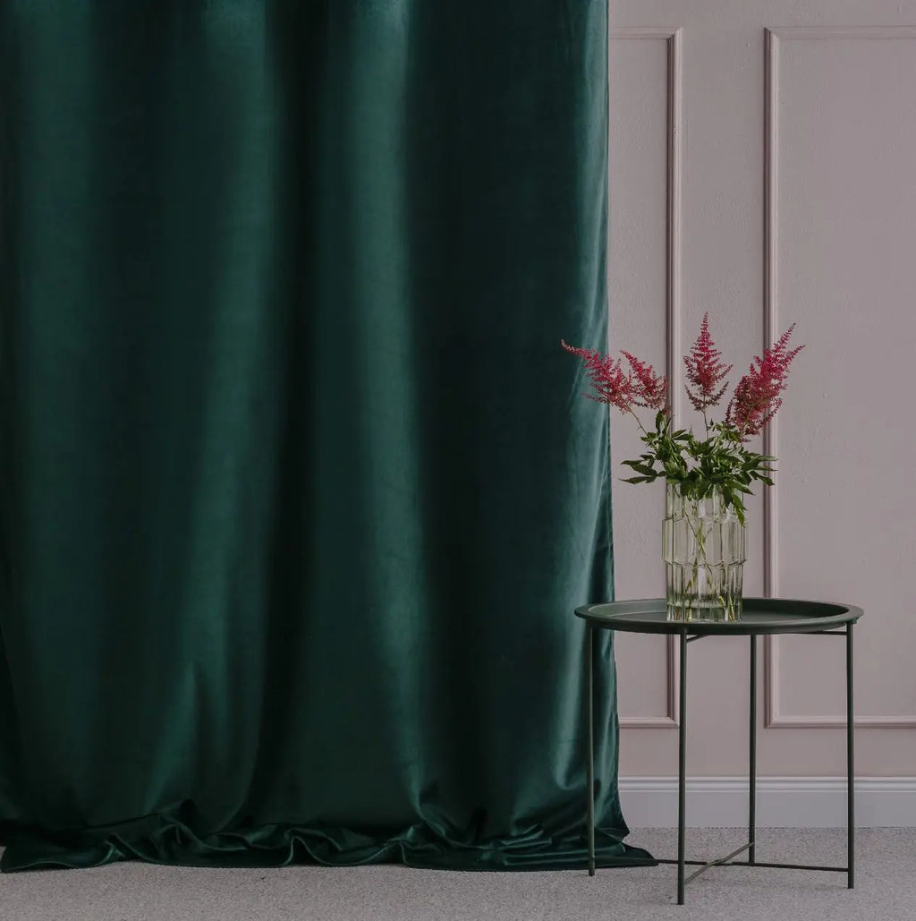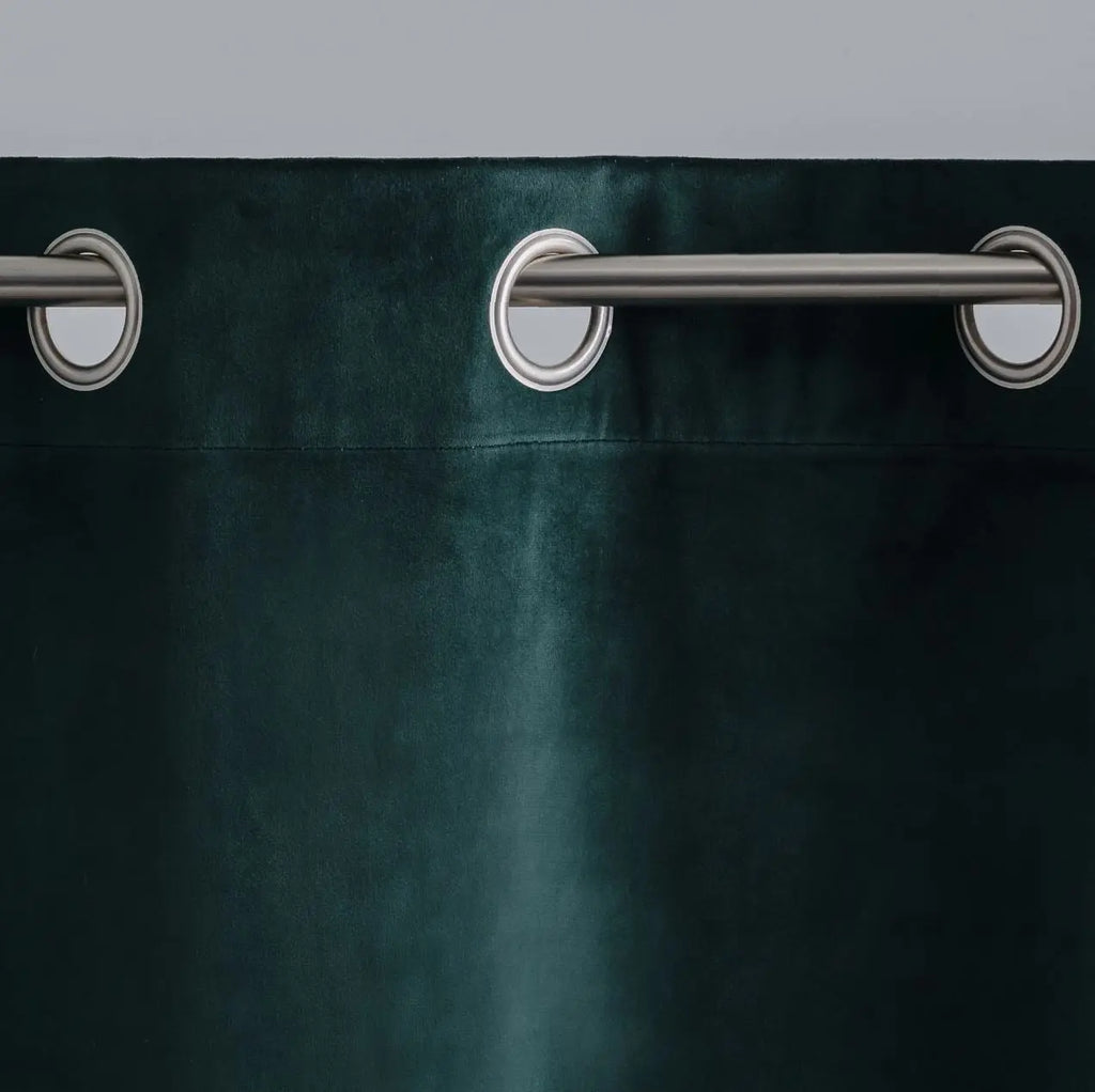Green polyester curtain. The soft and strong fabric of this curtain blocks sunlight, drafts and helps keep the cold outside. It will change your interior and give it a special character. The attachment method creates beautiful waves and enables easy handling of the curtain.