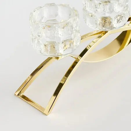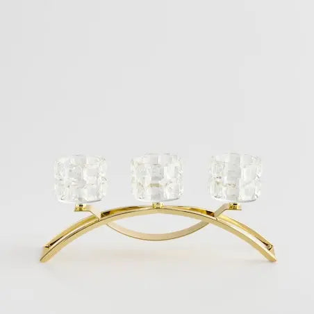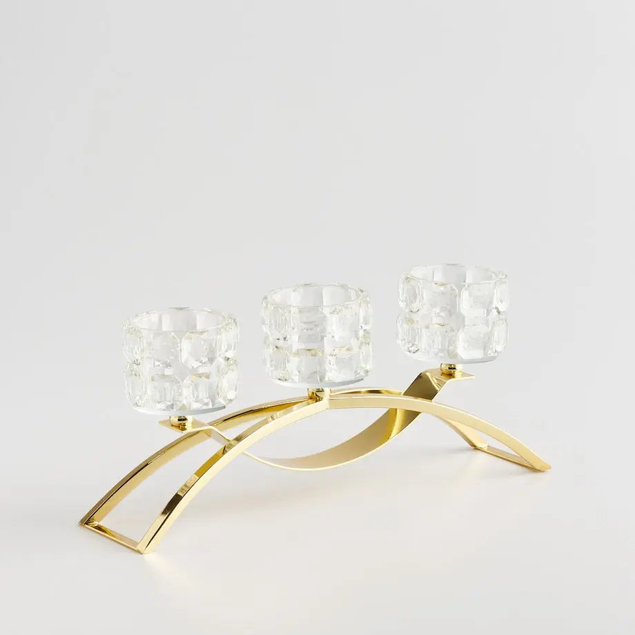 This gold metal and crystal three-tealight candle holder is an elegant decoration that will add a touch of luxury to any interior. The gold metal base perfectly complements the delicate crystal glass and the space for three tealights creates a cozy and atmospheric atmosphere. It is ideal for the living room, dining room or bedroom and fits well in both modern and classic interiors.