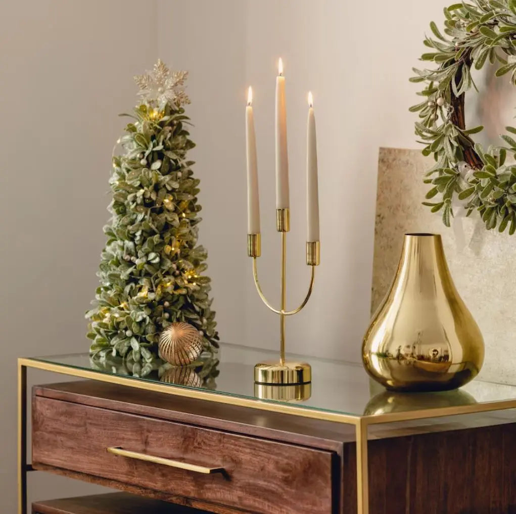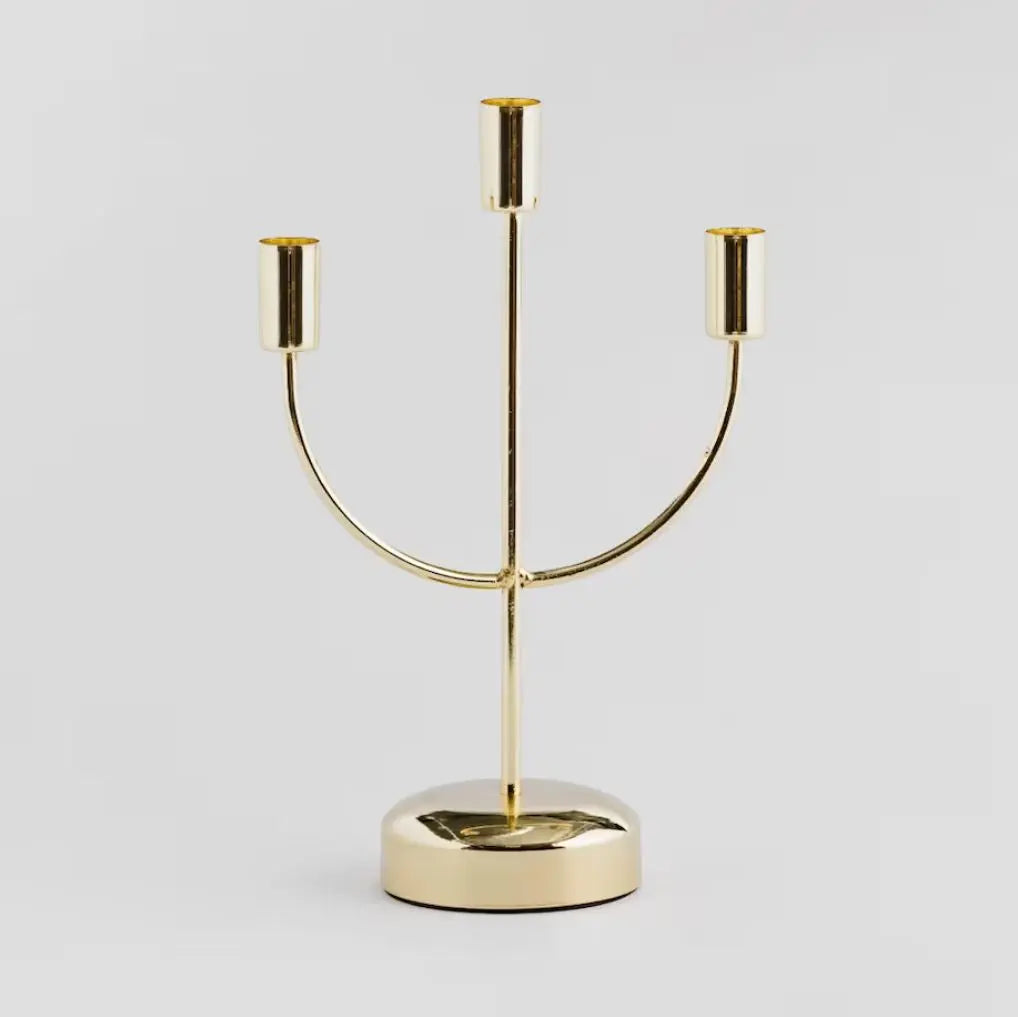 Golden metal candlestick. It will perfectly decorate your dining table or complement your interior. It finds its place and application in every room and transforms it nicely. The warm light of candles will create a calm and cozy atmosphere in every room.