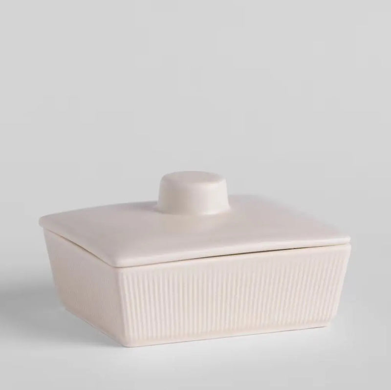 Beige butter jar made of hardened porcelain. It is suitable for classic, modern and rustic kitchens. It creates a pleasant dining experience.