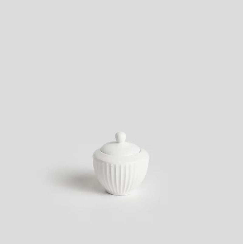 White porcelain sugar bowl. An elegant sugar bowl that fits into classic, modern and rustic kitchens. It creates a pleasant dining experience.