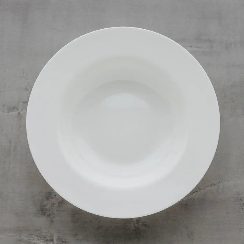 White porcelain deep plate. Ideal for formal lunches and everyday occasions. It will look really beautiful on a set table. It will create a pleasant dining experience.