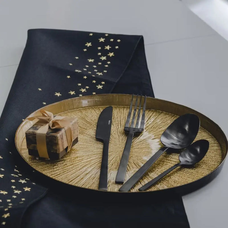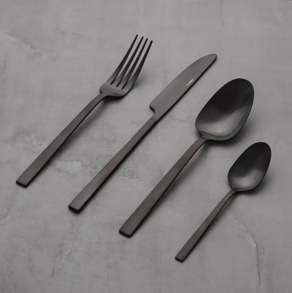 Black cutlery set with a matte finish. It fits perfectly into the modern, elegant aesthetics and is an original dining accessory. Stainless steel cutlery is resistant to chemical and electrochemical reactions and remains in good condition for a long time. However, they should not be washed in the dishwasher. The cutlery set consists of one teaspoon, a spoon, a fork and a knife.