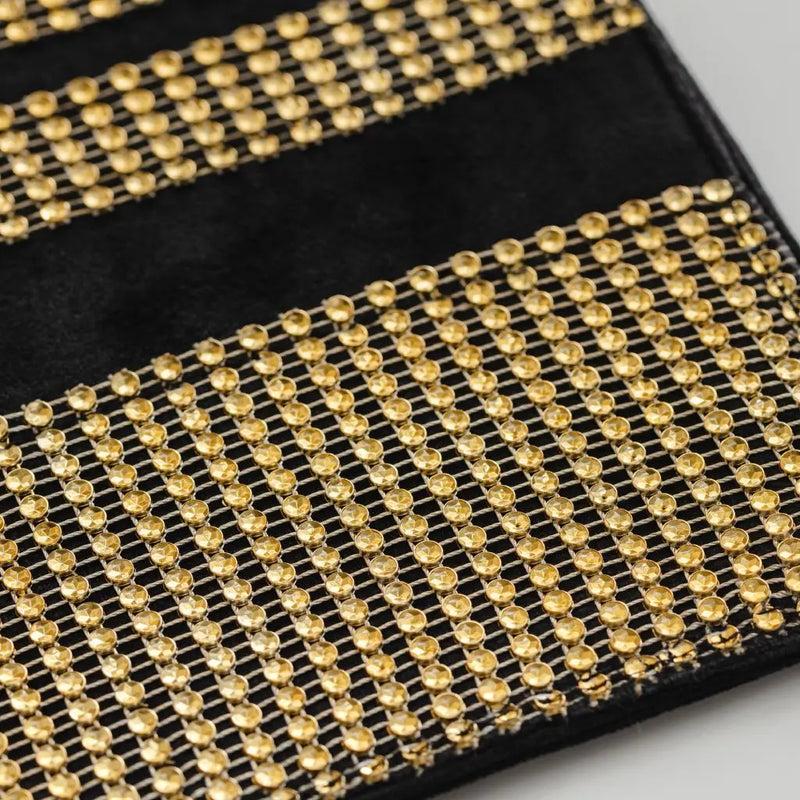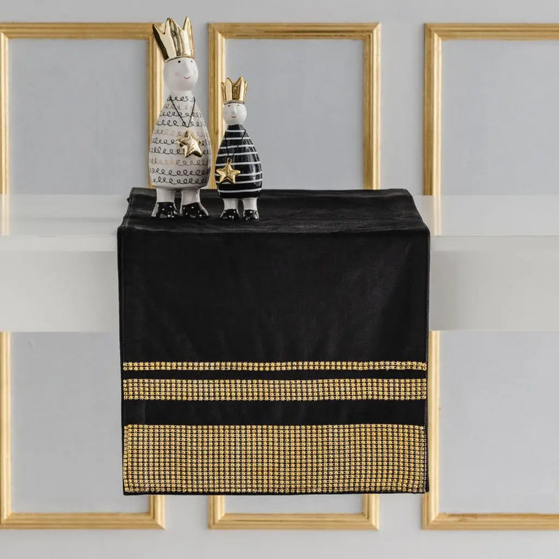 Black and gold polyester stole. It is not only a nice decorative addition to your table, but also protects the top plate from damage and stains. It will perfectly decorate your dining table or complement your interior.