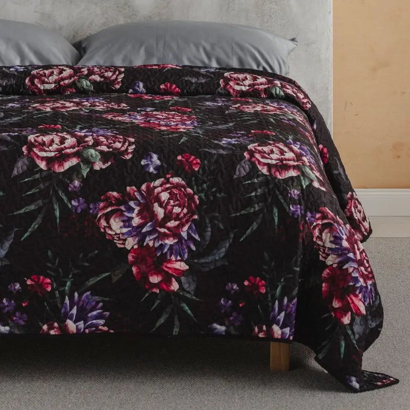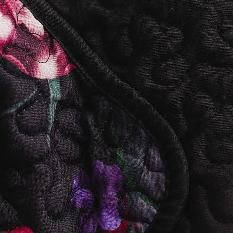 Black polyester bedspread with floral motif. It will help you liven up your bedroom decor. It is a practical but also a decorative element of the room that will give it a cozy and neat look. At the same time, it protects the bed from dirt and dust. A well-made bed is the basis of quality sleep.