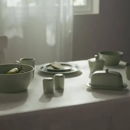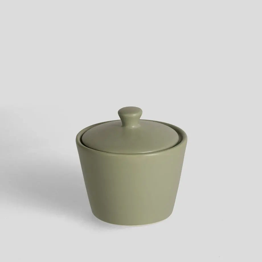 The porcelain sugar bowl with green reactive glaze is an elegant piece of tableware. It impresses with its unique color effect, which gives it a unique character. It is ideal for serving sugar during coffee or tea gatherings, combining functionality with aesthetics and giving the tableware a natural and stylish accent.