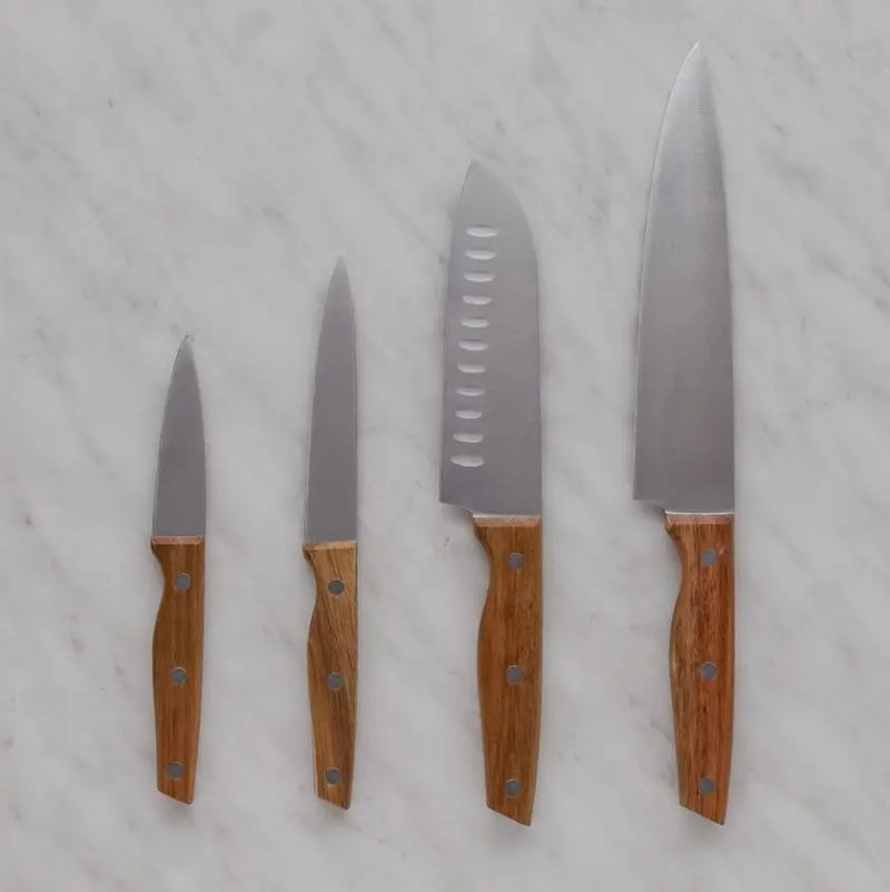Brown with a set of knives with a cutting board. They have a classic design. Suitable for households as well as for professional gastronomy.