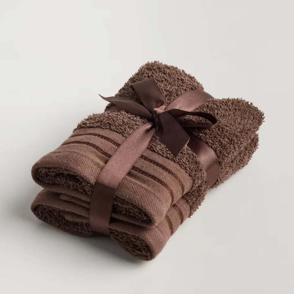 Brown towel set. The product is made of cotton. It has excellent absorbency and antibacterial properties. Its soft texture is safe for sensitive skin, and antibacterial properties help protect the skin from the development of bacteria.