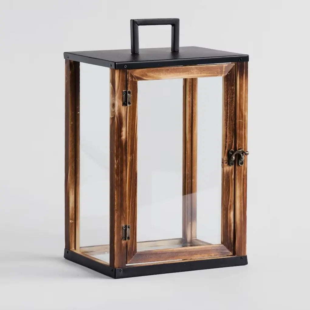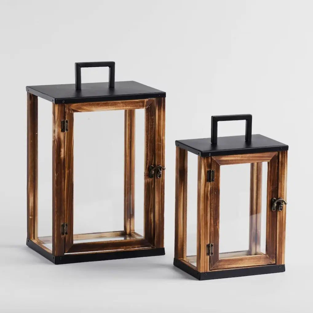 Brown lantern made of metal, wood and glass. Create a romantic atmosphere with a decorative lantern. The warm light of the candles will create a calm and cozy atmosphere.