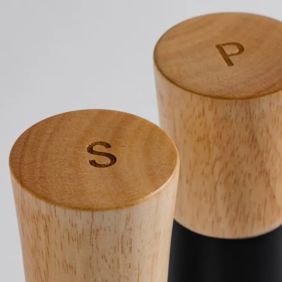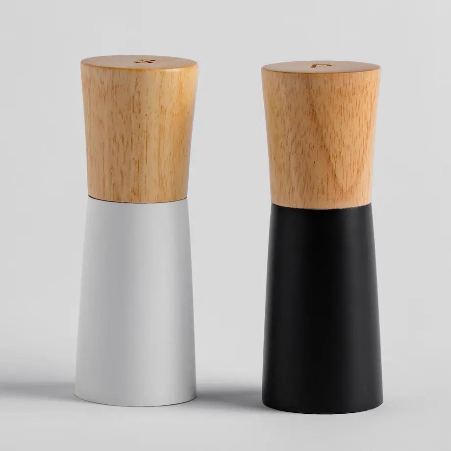 A set of elegant salt and pepper mills. Each mill ensures convenient use and precise grinding of salt and pepper. It is a stylish and functional addition to any kitchen.