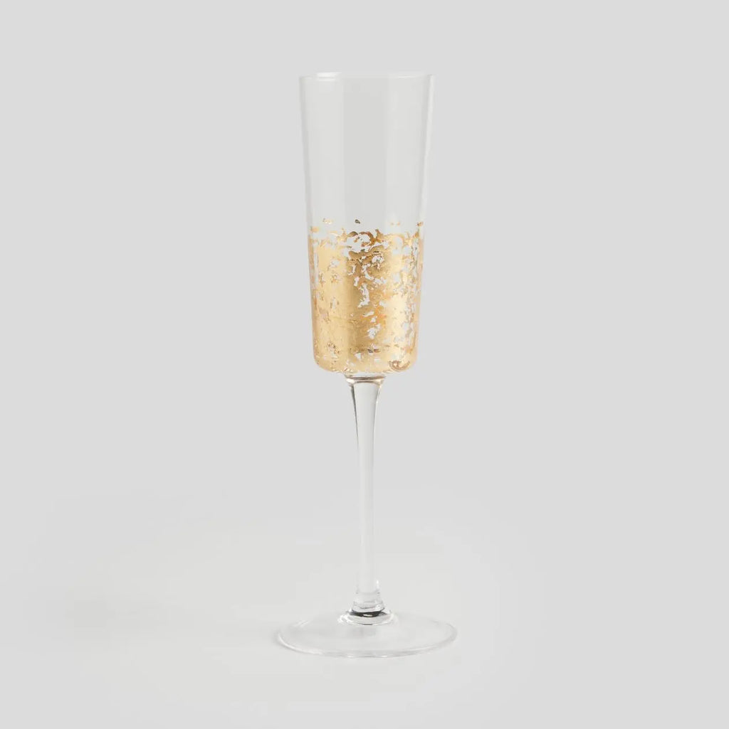 Transparent champagne glass with gold decoration. Made of high-quality material. Ideal for formal dinners and everyday occasions. It will look really beautiful on a set table. It will create a pleasant dining experience.