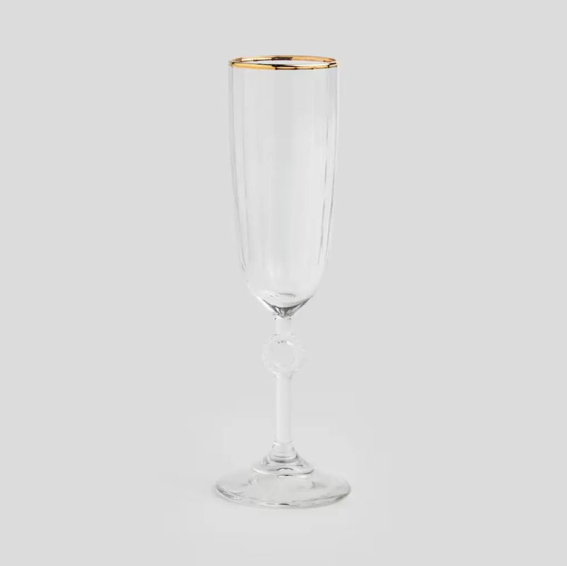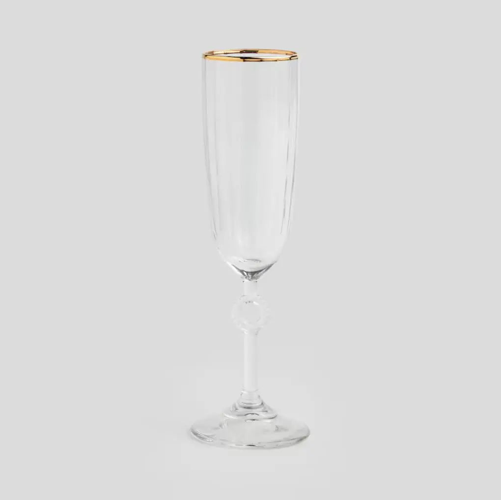 Transparent champagne glass with gold rim. Made of quality material. Ideal for festive lunches and casual occasions. It will look really beautiful on the table. It creates a pleasant dining experience.