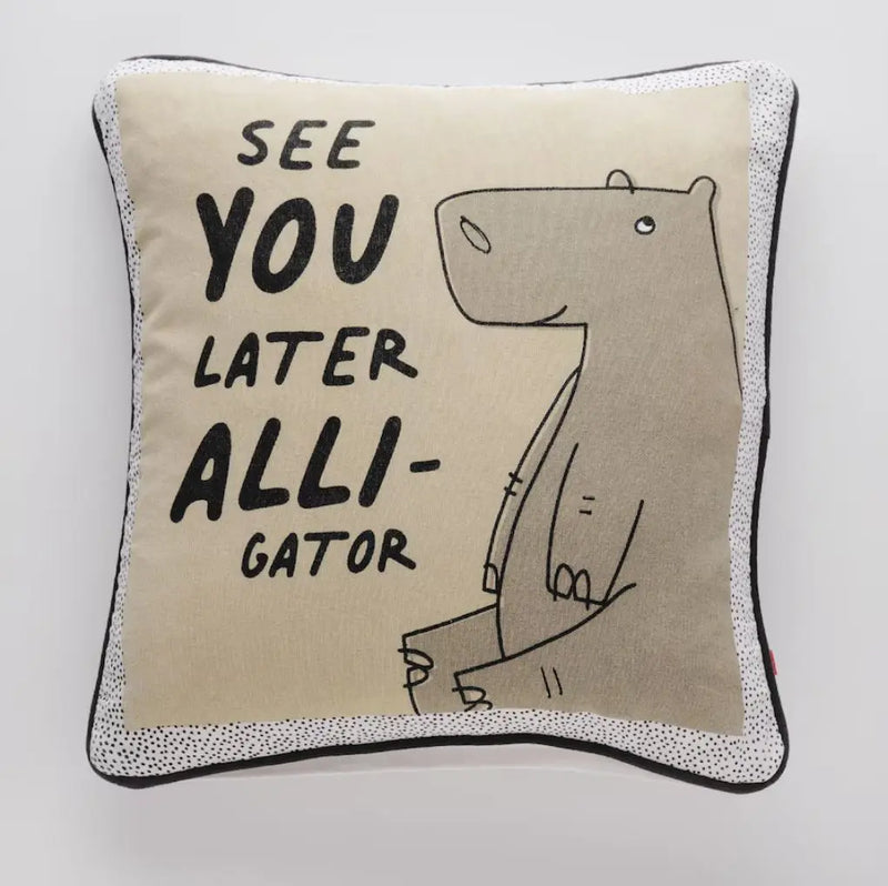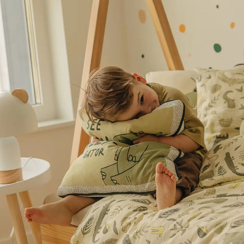Green children's pillowcase with a hippopotamus and the inscription 'SEE YOU LATER ALLI-GATOR'.