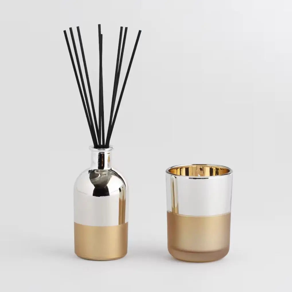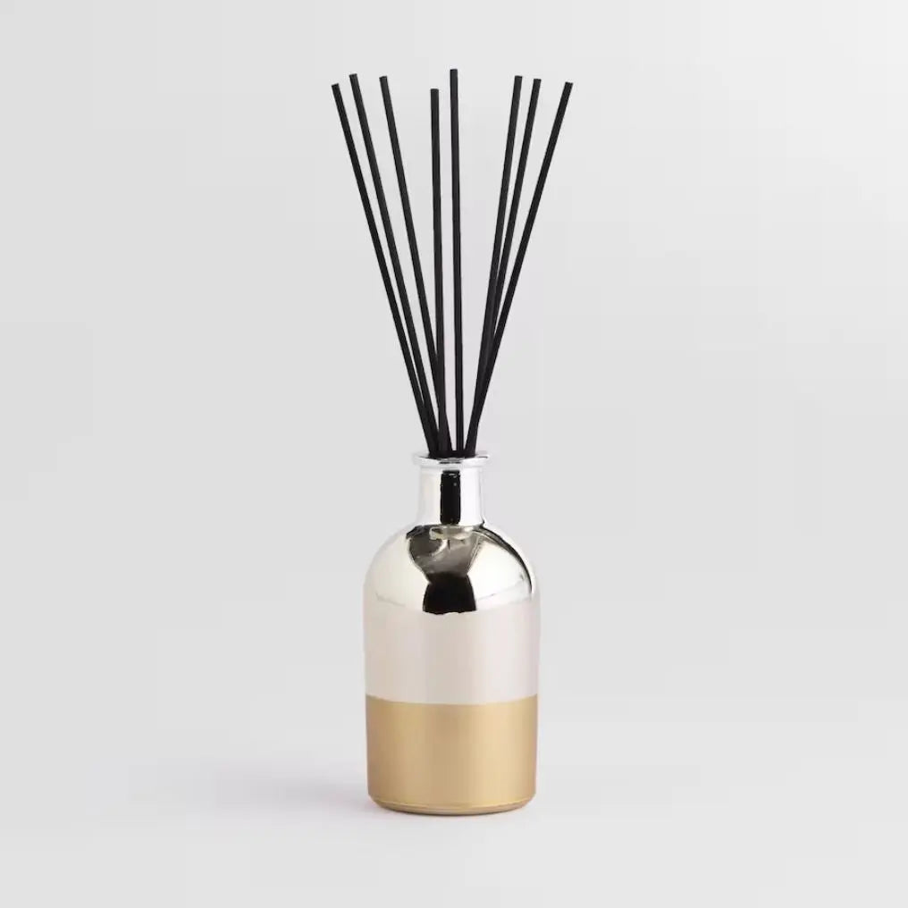 Golden aroma diffuser. The air freshener is not only a practical means of improving the air quality in your home, but also a stylish decorative accessory. Long wooden sticks placed in a bottle effectively spread the fragrance and create a pleasant atmosphere in any room. This air freshener, ideal for the living room or bathroom, will not only purify the air, but also add elegance and charm to your interior.