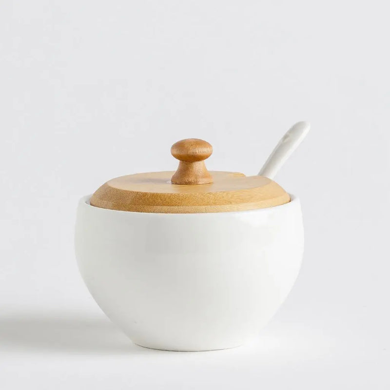 Biela porcelánová cukornička. Elegantná cukornička s dreveným viečkom a porcelánovou lyžičkou sa hodí do klasickej, modernej i rustikálnej kuchyne. Vytvorí príjemný dojem zo stolovania.