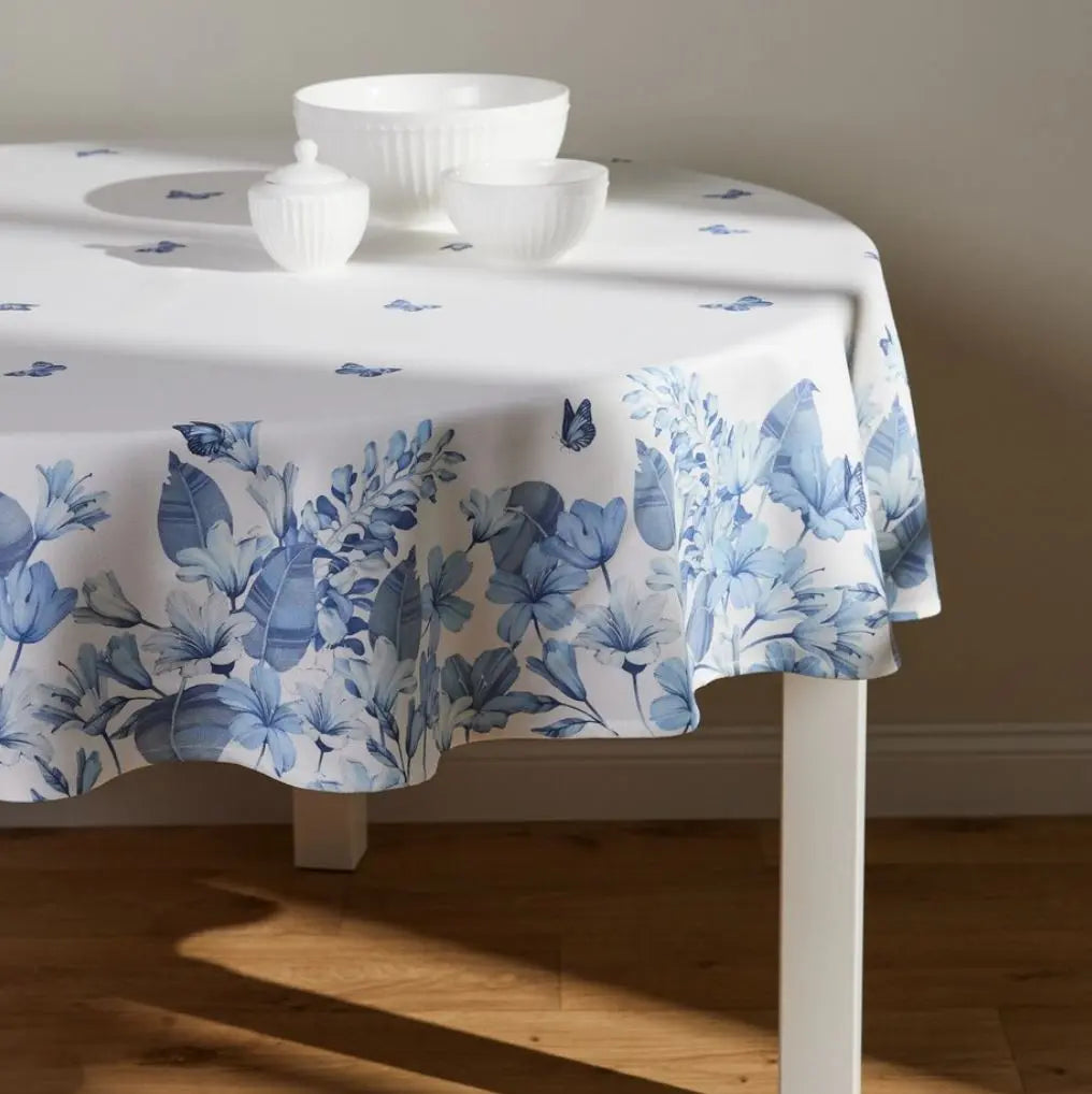 Bielo modrý polyesterový obrus. Je nielen pekný dekoratívny doplnok vášho stola, ale taktiež ochráni vrchnú dosku pred poškodením a fľakmi. Skvelo ozdobí váš jedálenský stôl alebo doplní váš interiér.
