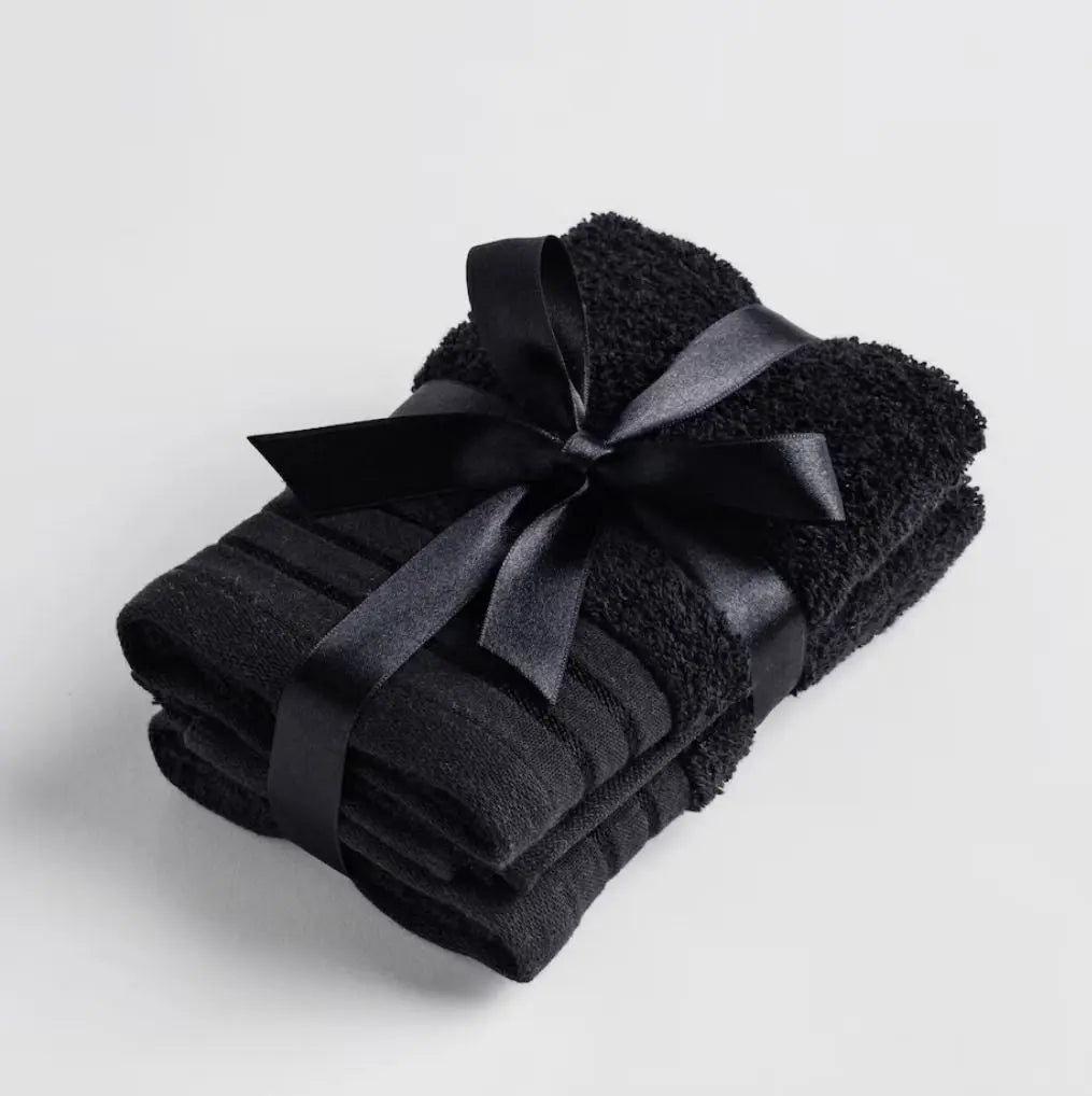 Čierna sada uterákov. Výrobok je vyrobený z bavlny. Má výbornú savosť a antibakteriálne vlastnosti. Jeho jemná štruktúra je bezpečná pre citlivú pokožku a antibakteriálne vlastnosti pomáhajú chrániť pokožku pred vývojom baktérií.