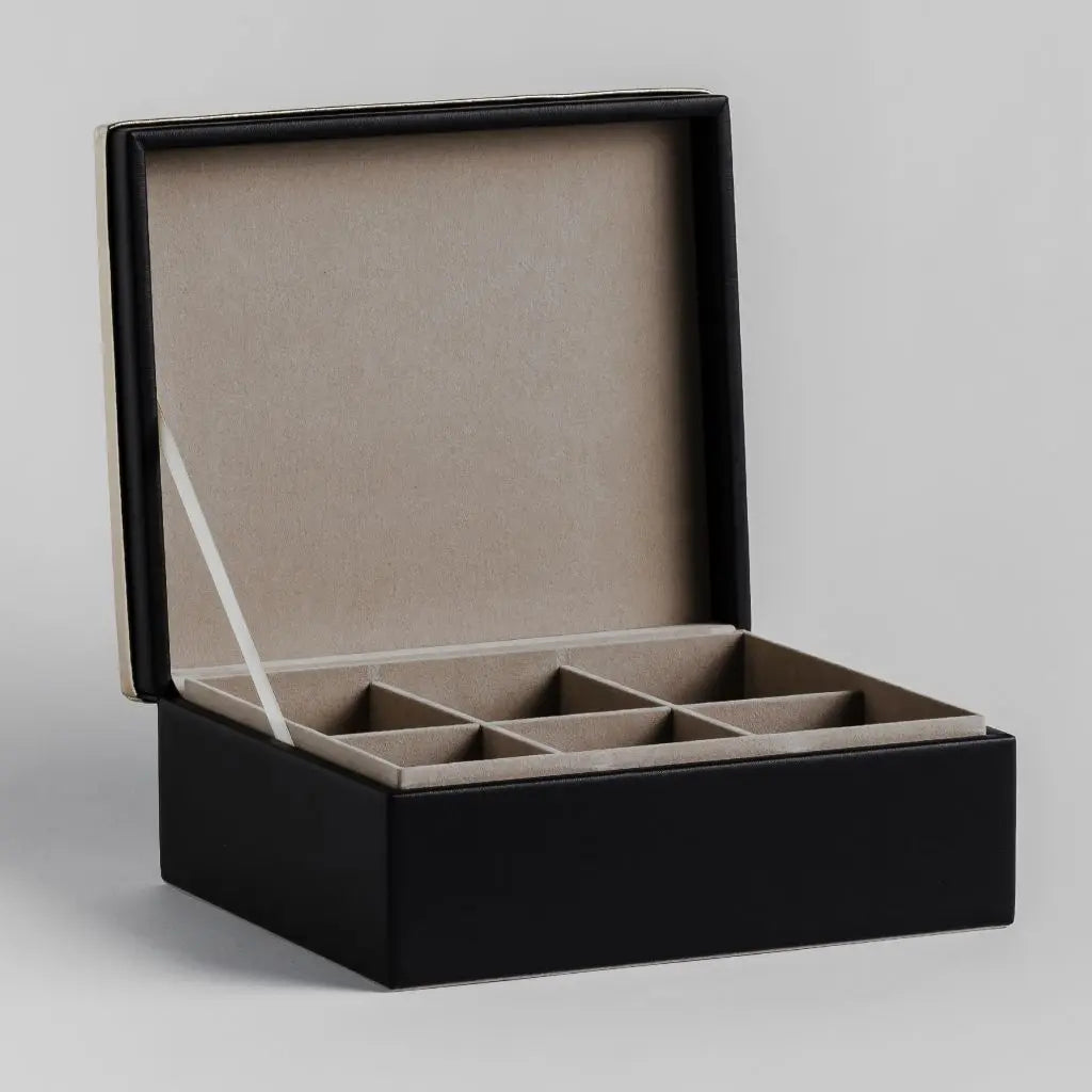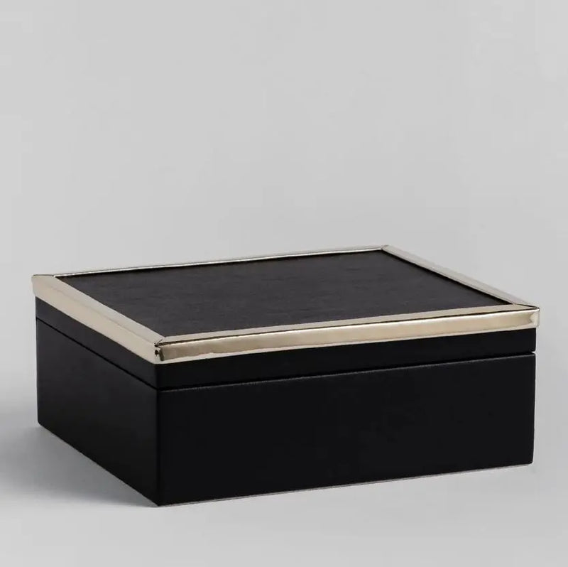 Čierna šperkovnica so zlatým lemom a sivým vnútrom. Strieborná zrkadlová šperkovnica. Okrem elegantného a očarujúceho vzhľadu je mimoriadne praktickým doplnkom vhodným do akejkoľvek miestnosti. Je ideálna na odkladanie šperkov a vyzerá výborne na akomkoľvek stolíku či polici.