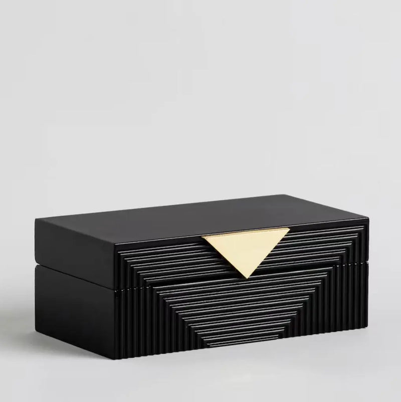 Čierna šperkovnica so zlatými doplnkami. Okrem elegantného a očarujúceho vzhľadu je mimoriadne praktickým doplnkom vhodným do akejkoľvek miestnosti. Je ideálna na odkladanie šperkov a vyzerá výborne na akomkoľvek stolíku či polici.