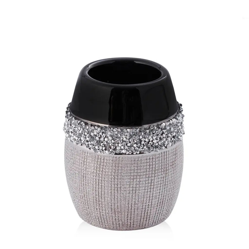 Čierno strieborný kúpeľňový pohár. Dokonalý doplnok k dizajnu interiéru vašej kúpeľne. Poskytuje pohodlie a hygienu pri každodenných činnostiach v kúpeľni. Ideálny na odkladanie zubných kefiek a zubnej pasty.