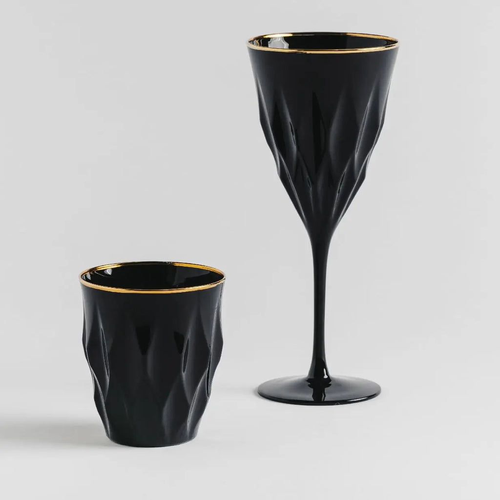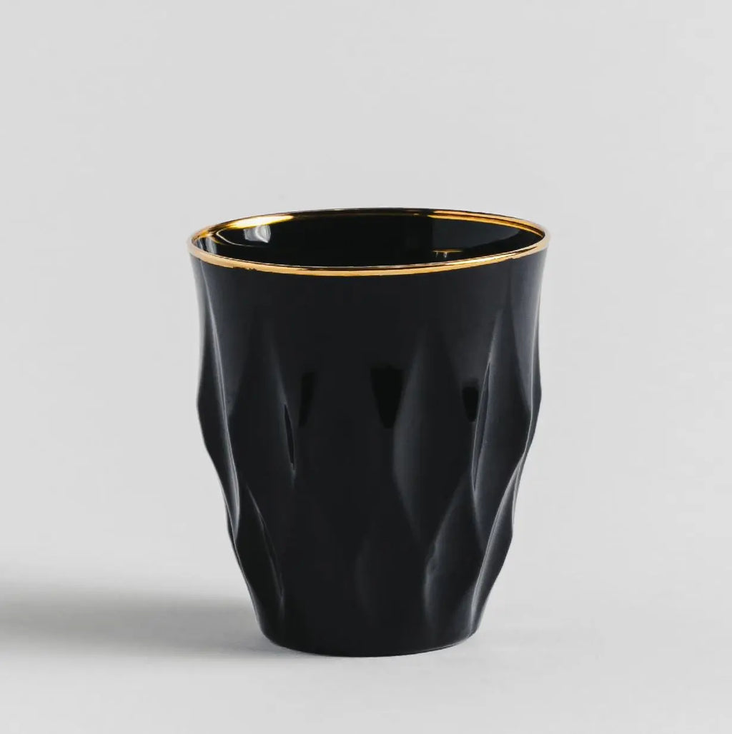 Čierny sklenený pohár so zlatým lemom.
