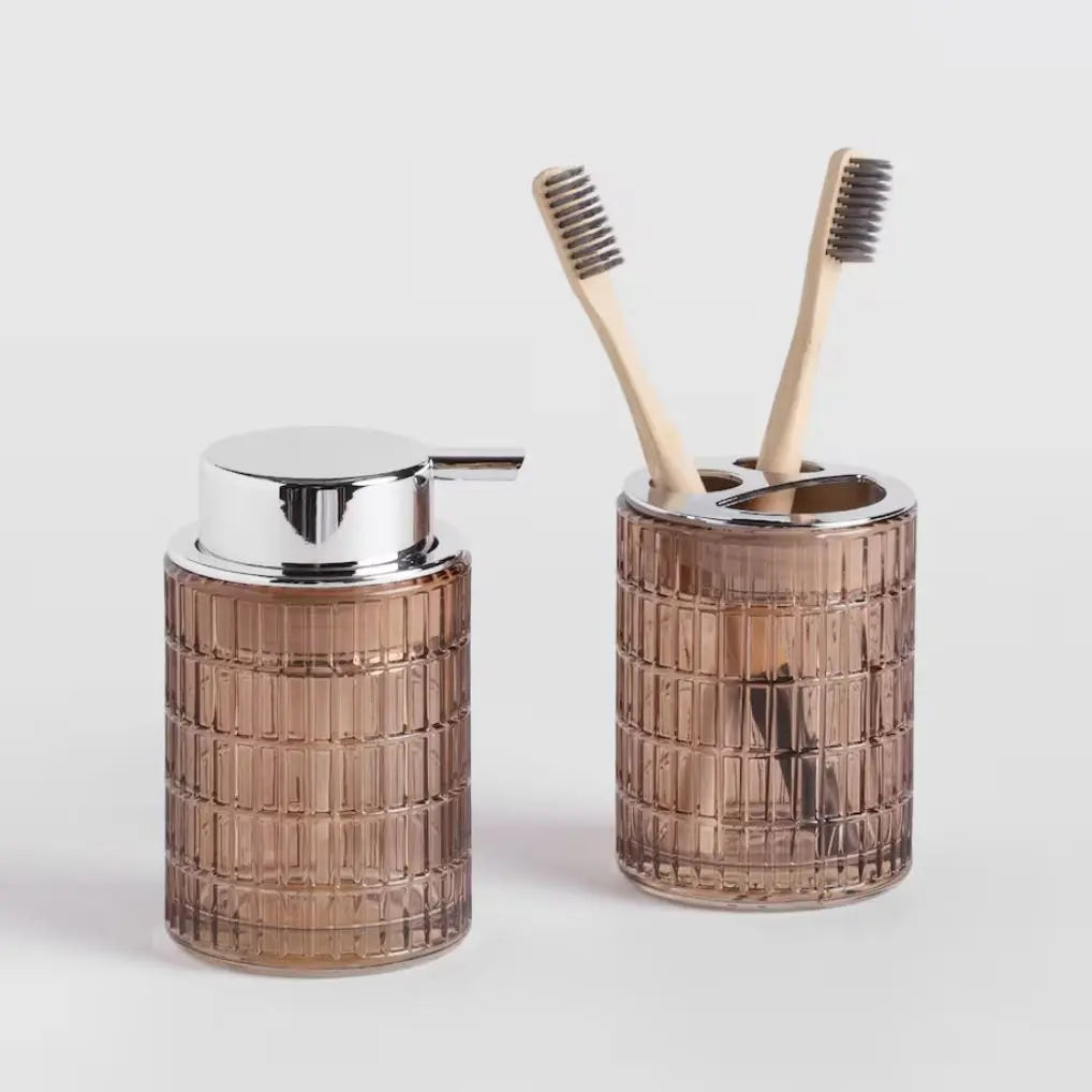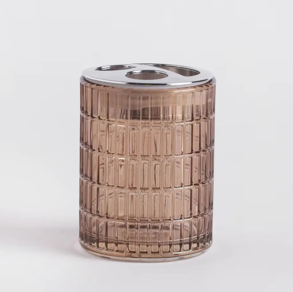 Hnedý sklenený kúpeľňový pohár. Dokonalý doplnok k dizajnu interiéru vašej kúpeľne. Poskytuje pohodlie a hygienu pri každodenných činnostiach v kúpeľni. Ideálny na odkladanie zubných kefiek a zubnej pasty.