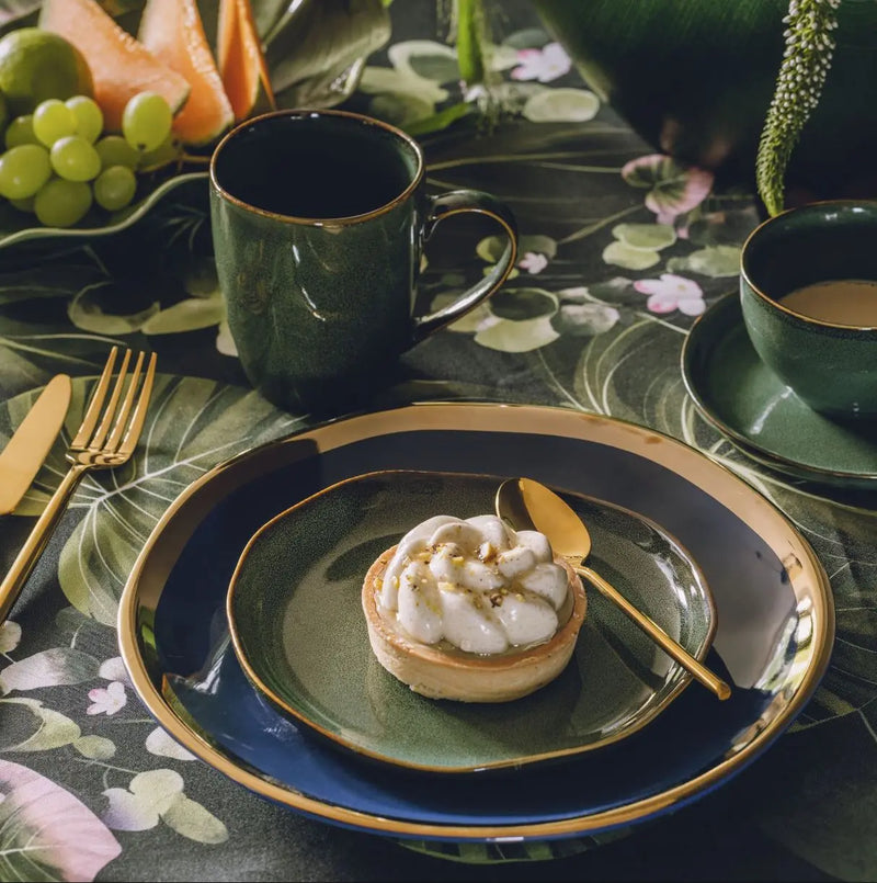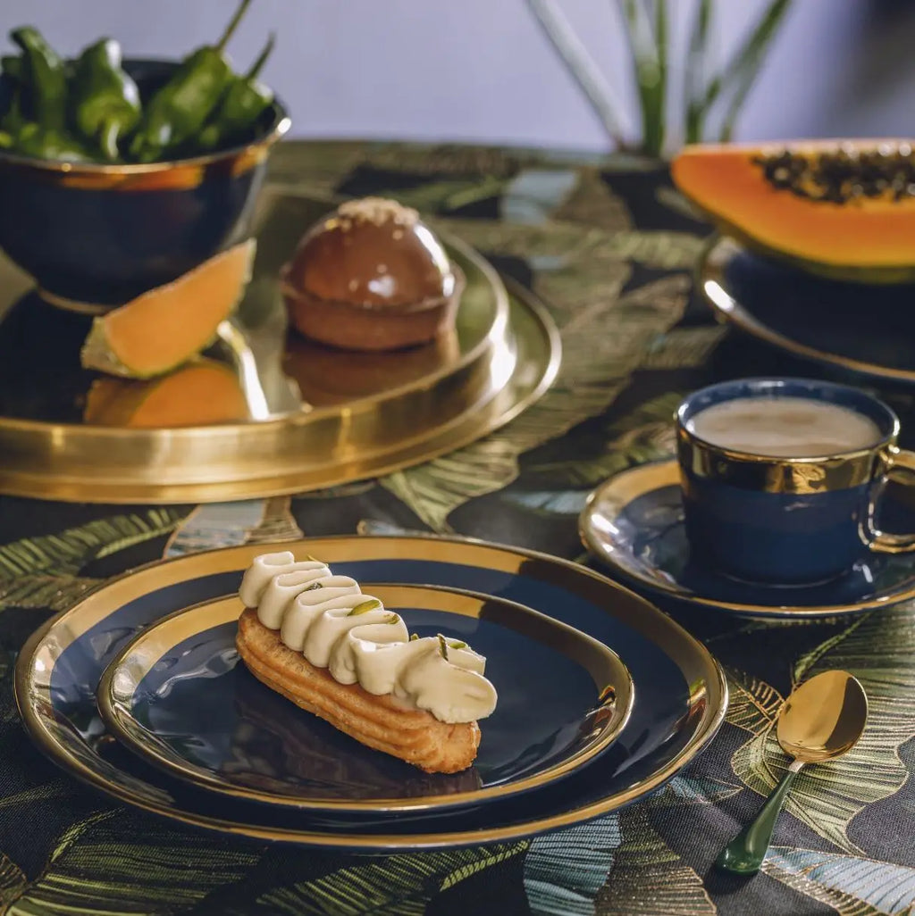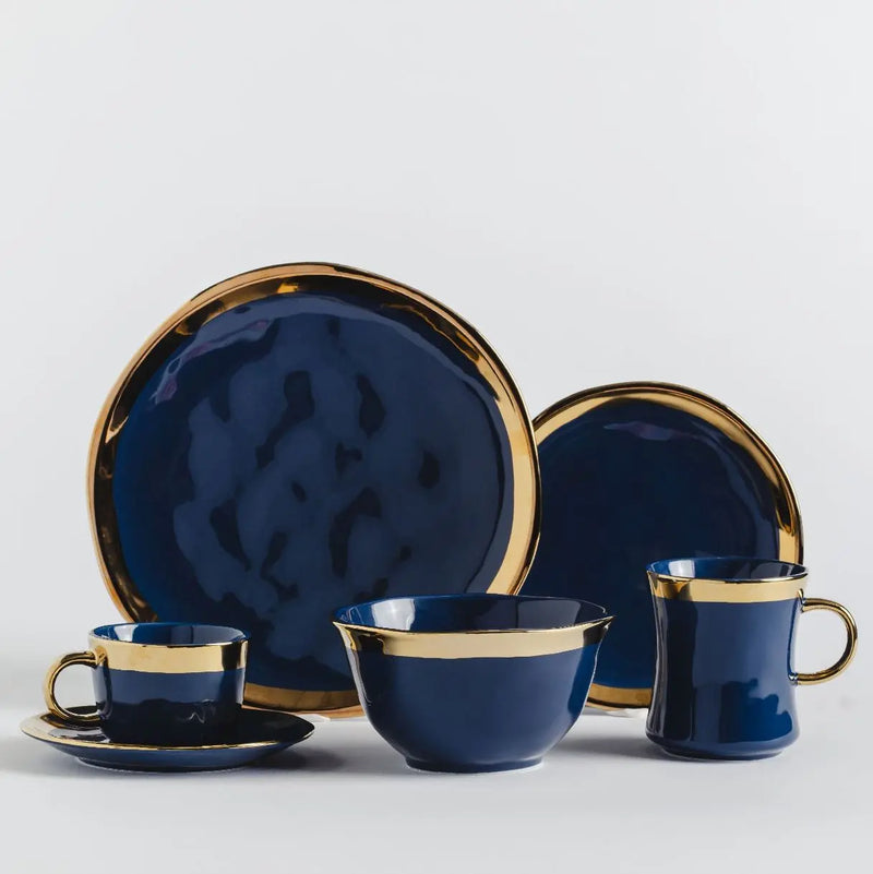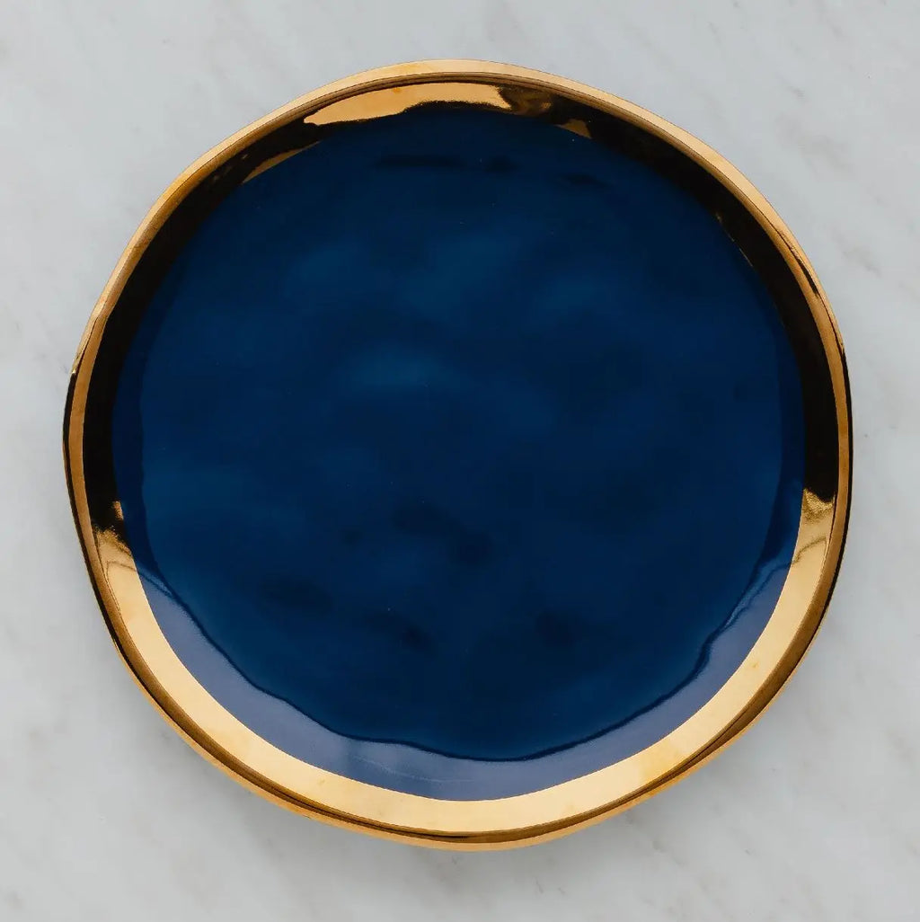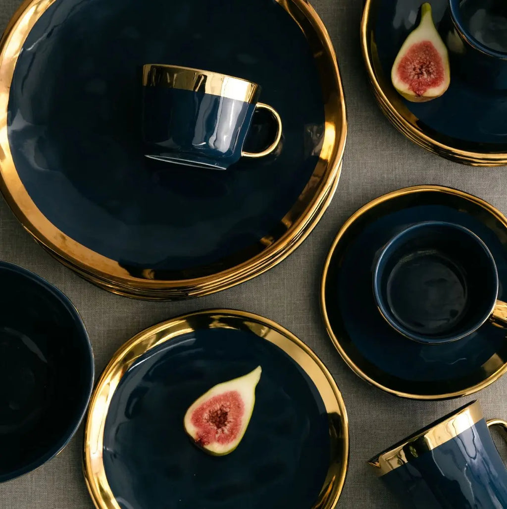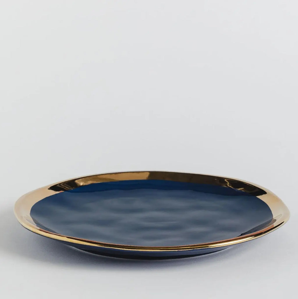 Modro zlatý plytký porcelánový tanier so zlatým lemom. Ideálny na slávnostné obedy aj bežné príležitosti. Na prestretom stole bude vyzerať naozaj krásne. Vytvorí príjemný dojem zo stolovania.